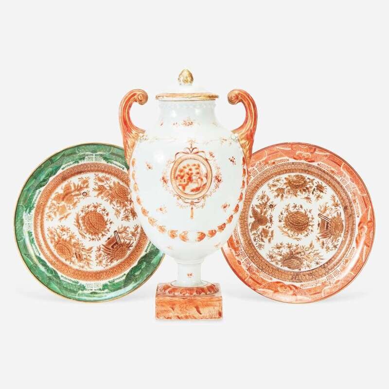 Comprising an orange pistol-handled urn and cover and two double-color plates, one orange and sepia, the other orange and green.