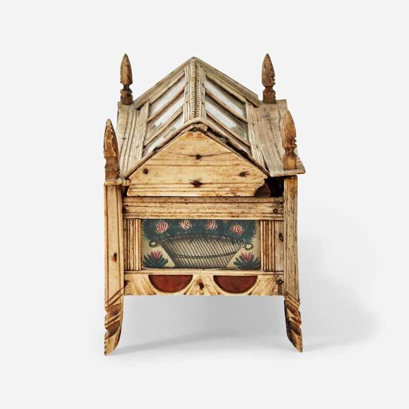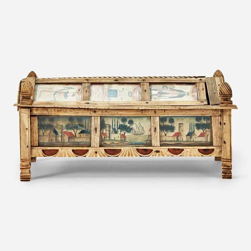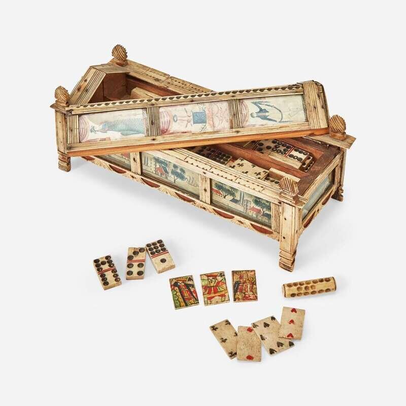 Casket form, with sliding roof-top cover, overall with fourteen watercolor panels displayed behind glass, the case featuring town and seascapes to sides and flower basket and urn to ends, the cover depicting two amorous couples and two pairs of hearts pierced with arrows; containing game pieces including painted bone playing cards, dominoes, and a single teetotum; retaining old written label (illegible) to underside.