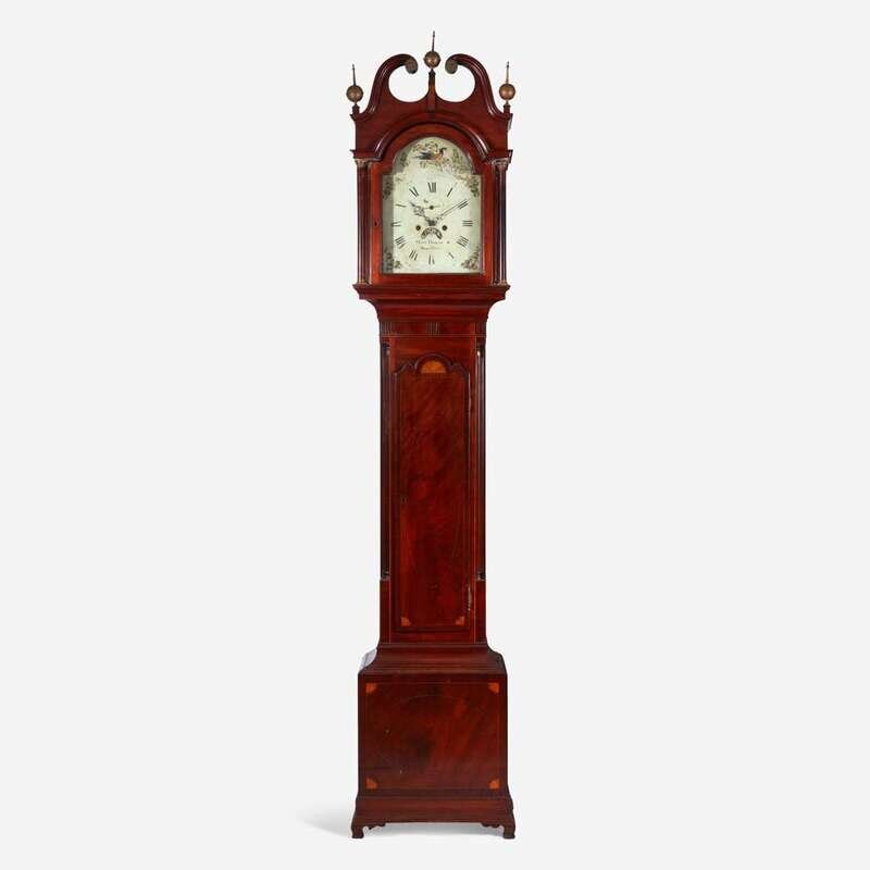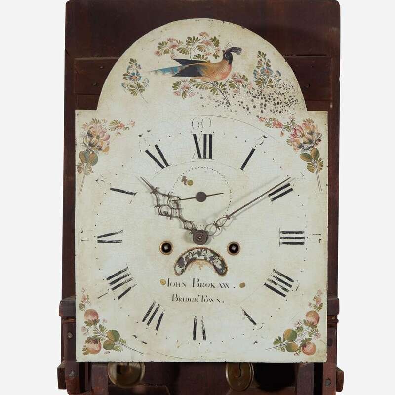 Enamel-painted face decorated with bird, flower, and strawberry motifs, inscribed, "John Brokaw BridgeTown," the hood with broken pediment to cornice, centered and flanked by brass ball and steeple finials, the glazed arched door flanked by columns, the case with arched door inlaid with fan motifs, flanked by engaged quarter columns, a rectangular base with fan inlay, on shaped bracket feet.