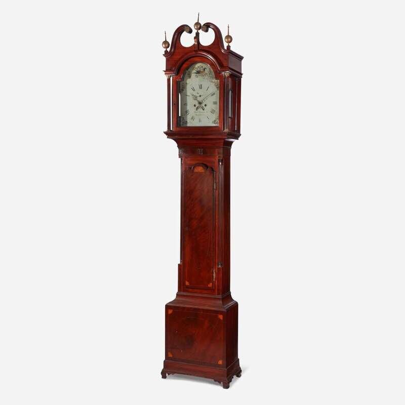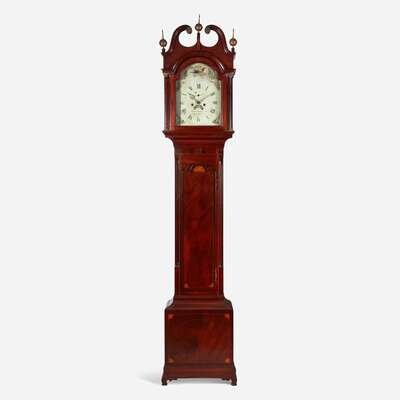 A Federal inlaid mahogany tall case clock Works by John Brokaw, Bridge Town, what is now Rahway, NJ, circa 1800