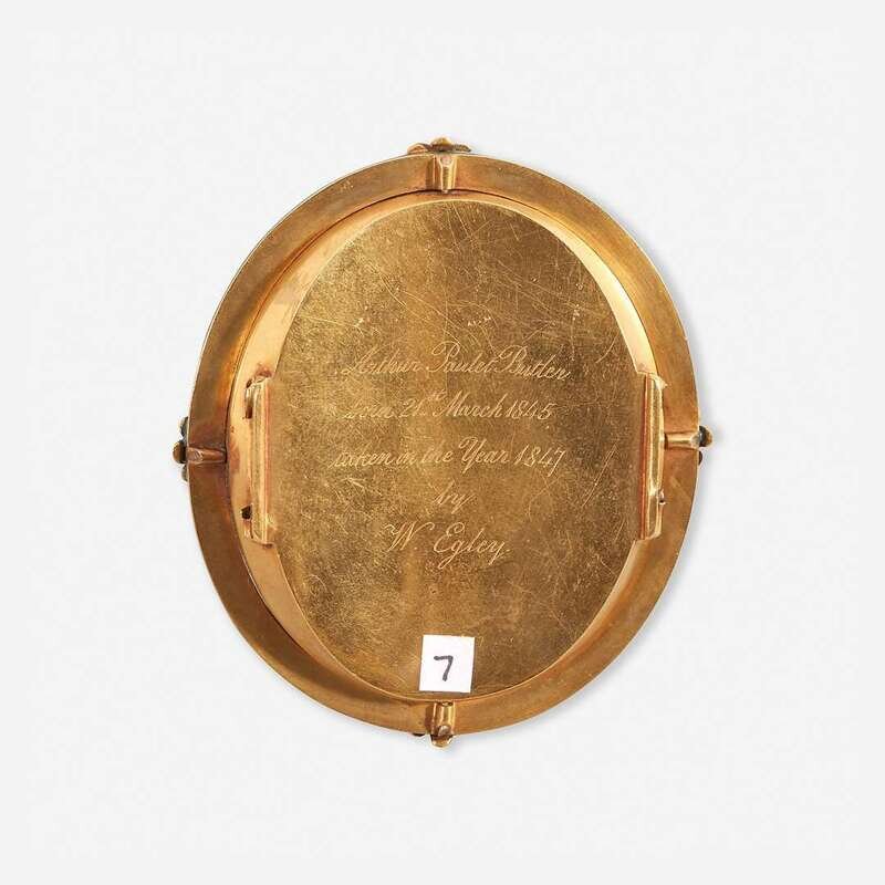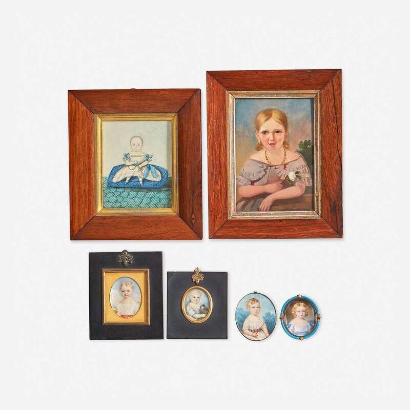 Comprising a portrait of young girl in a lavender dress holding a white rose, by William Egley (English, 1798-1870), circa 1845, oil on board, framed; a portrait of Arthur Paulet Butler (1845-1872) wearing a white dress with blue ribbons, by William Egley (English, 1798-1870), dated "1847", watercolor, gilt and enamel case engraved verso, "Arthur Paulet Butler/ born 21st March 1845/ taken in the Year 1847/ by W. Egley"; a portrait of a young child on a pillow with rattle, Scottish School, pencil and watercolor on paper, framed, with old framer label verso, "Adam Dick/ Carver & Gilder A Mirror Glass Frame Manufacturer/ 92 Princes Street, Edinburgh"; a portrait of a child with blond ringlets and wearing white dress with red sash, Scottish School, watercolor, matted and framed; a portrait of a child in a white dress and bonnet holding a dog, Scottish School, watercolor, framed; and a portrait of a child with white dress, striped sash, and holding a whip, Scottish School, watercolor, gilt locket case.
