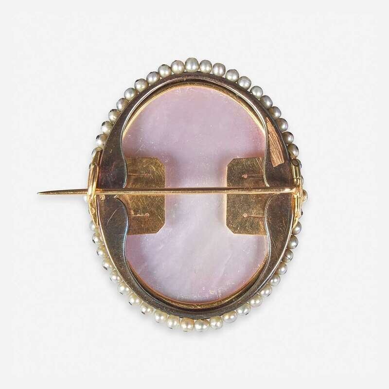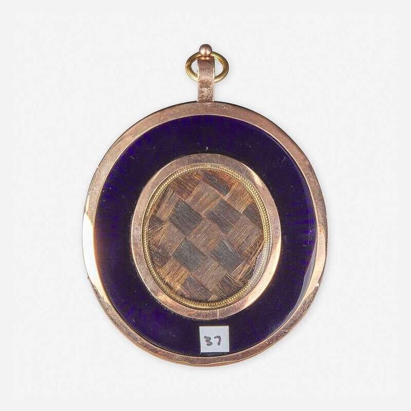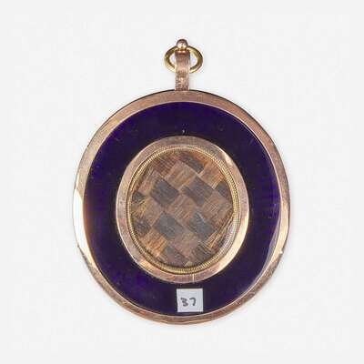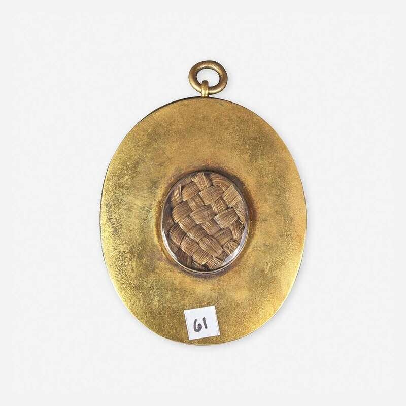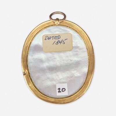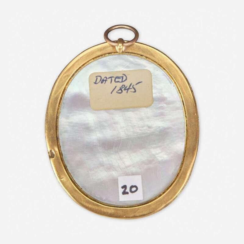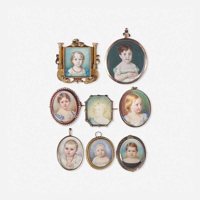 Comprising a memorial portrait of a red-haired child wearing black, English School, circa 1850, gilt and enamel case, verso with pin; a portrait of a baby in white gown wearing coral necklace, English School, circa 1800, gilt locket case, silk backing verso; a memorial portrait of a young girl with blond hair and blue ribbons at shoulders, possibly English School (or American), gilt locket case, engraved, "J.E.C./ March 1863", aperature with woven hairwork verso; a portrait of a young child with blond ringlets and off-the-shoulder dress, possibly English School, octagonal gilt case with pin verso, semiprecious backing (possibly green tourmaline), paper label verso inscribed, "Herbert...of Adl...For Herbert...of old...Hall (?)", a portrait of a child in white dress with blue ribbons and wearing coral necklace, Continental School, gilt "tableau" locket frame; a memorial portrait of young girl in a white dress with green sash and ribbons at shoulders, Continental School, signed and dated, "Corno 1817," l.l., gilt locket frame, verso with enamel and aperature containing woven hairwork; a memorial portrait of an infant in bonnet and white dress, by Melanie Bost (French, active early 19th century), signed and dated, "Mie Bost 1845", l.r., gilt locket case, mother-of-pearl backing; and a portrait of a young girl with blue ribbons at shoulders, by Melanie Bost (French, active early 19th century), signed in gilt, "Mie Bost," l.r., enamel, gilt, and seed pearl brooch case, with pin verso.