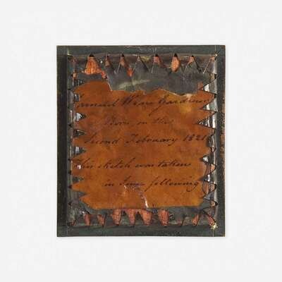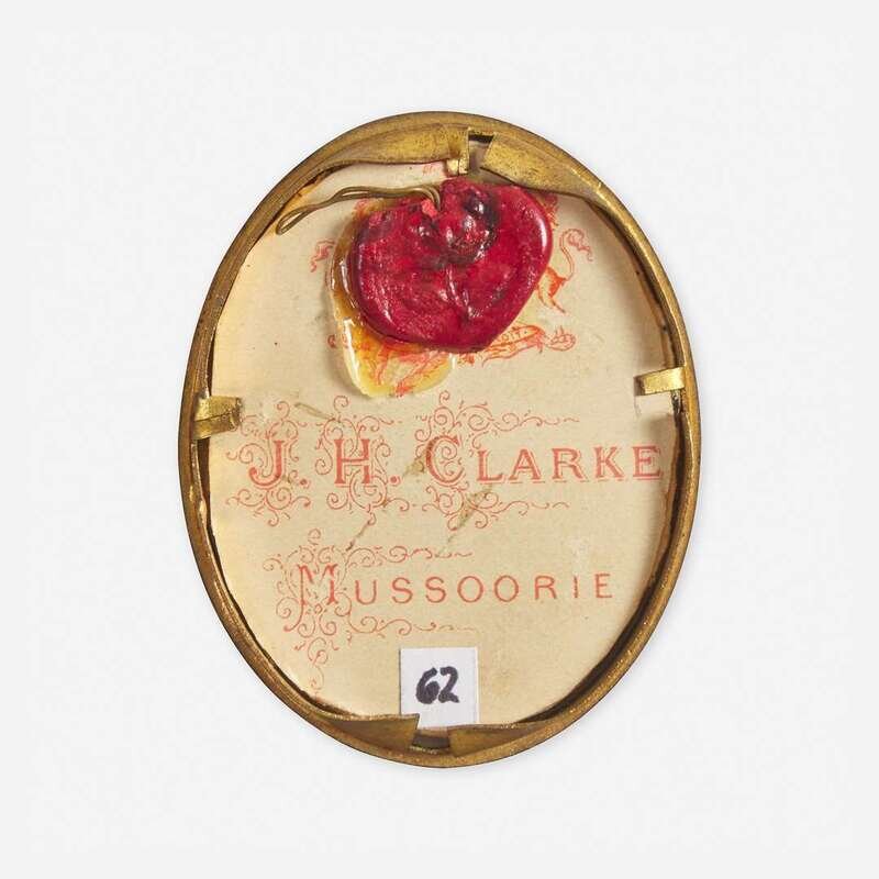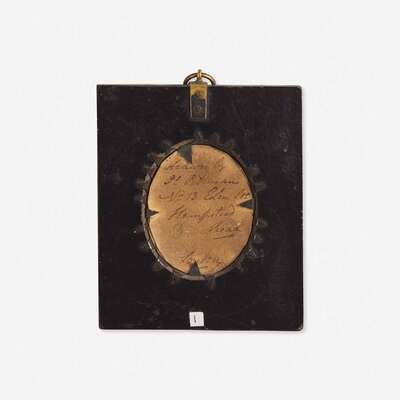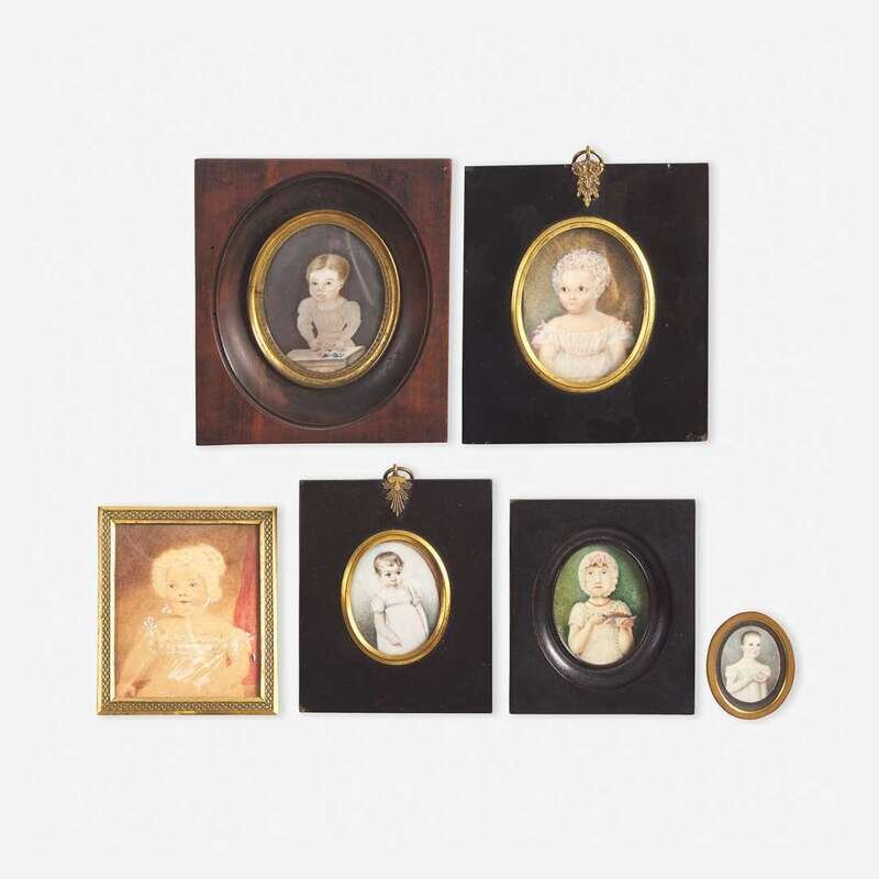 Comprising a portrait of a young girl in white holding a book, English School, oval gilt case, card backing and wax seal verso, the card printed, "J.H. Clarke Mussoorie"; a portrait of a little girl at a table with flowers, American School, framed; a portrait of Samuel Weare Gardiner (English, 1821-1866) in a white dress with blue bows at shoulders, English School, verso inscribed, "Samuel Weare Gardiner/ Born on the Second February 1821/ This sketch was taken in June following," watercolor on paper, brass frame; a portrait of a child in a white dress and cap with pink ribbons, American School, circa 1830, framed; a portrait miniature of a young girl in white Empire dress, verso inscribed, "drawn by J. Pittman/ No. 13 Eden St./ Hampstead Road, London," framed; and a portrait miniature of a young girl holding a plate of strawberries, possibly English School, framed; all watercolor.