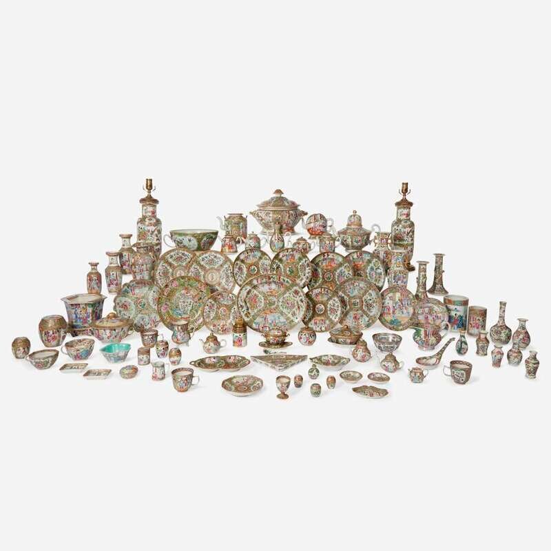 Comprising primarily 19th-century pieces, including a covered tureen, a covered dish and stand, two cylindrical brush pots, a vase and associated cover, a cylindrical coffeepot, seven teapots of various sizes (some miniature), a cadogan wine pot, a large coffeepot, a hexagonal jardinière and stand, a two-handled bowl and cover, a miniature covered tureen-on-stand together with small spoon, twelve vases of various sizes (some miniature), a pair of candlesticks, a small covered pitcher, three creamers (one miniature), five teacups, one teabowl and saucer, four miniature saucers / stands, a large bowl, a lobed bowl, a miniature bowl, ten round / cylindrical covered boxes or dishes of various sizes (most miniature), an egg cup, a brass-fitted lighter, a snuff bottle, twelve plates / dishes of various sizes, an oval platter with old staple repairs, five spoon / dish / teapot stands of various forms (two marked "Made in China"), and a pair of vases mounted as lamps.