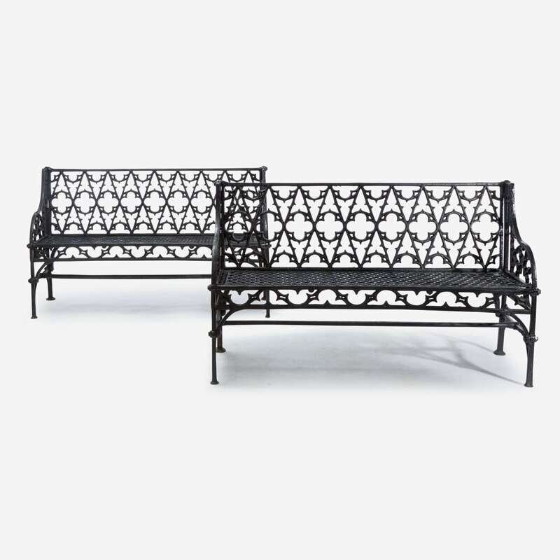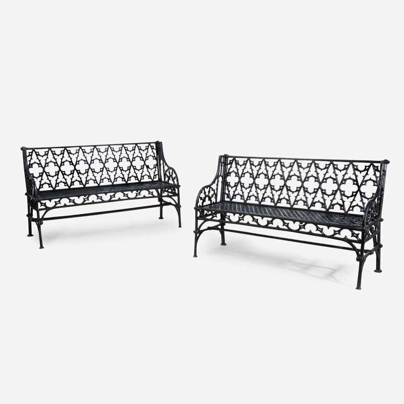 A pair of Gothic Revival black-painted cast iron garden benches 20th century