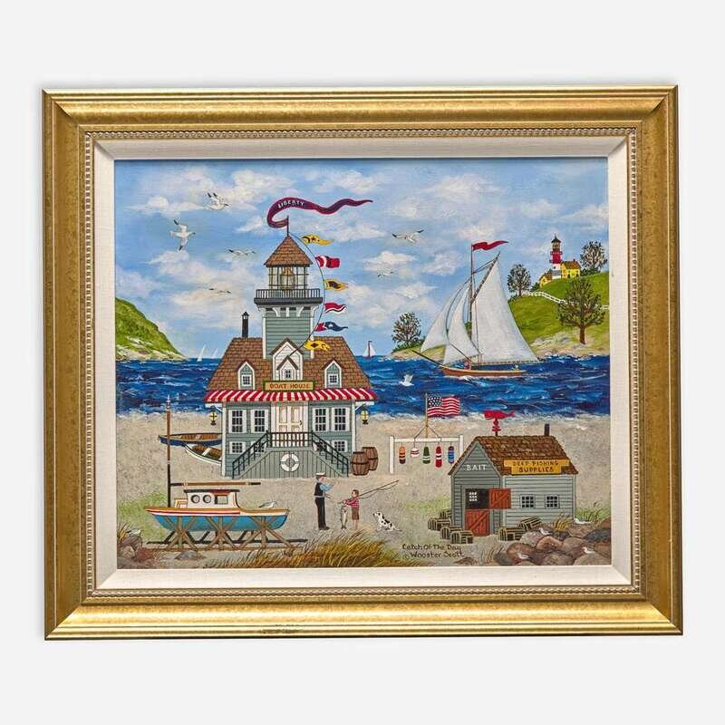 Titled and signed, "Catch of the Day/ © Wooster Scott," l.r., oil on canvas, framed.