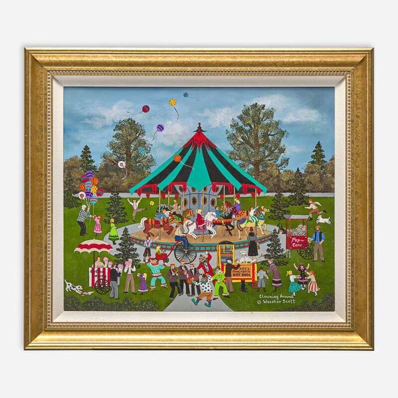Titled and signed, "Clowning Around/ © Wooster Scott," l.r., oil on canvas, framed.
