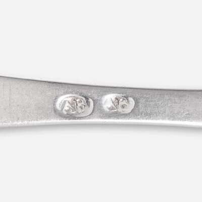 "Hanoverian" mid-rib form, with drop at bowl back, each engraved with monogram, "A/ G*L/ L," to underside of handle end, each marked twice, "AB," to underside of handle