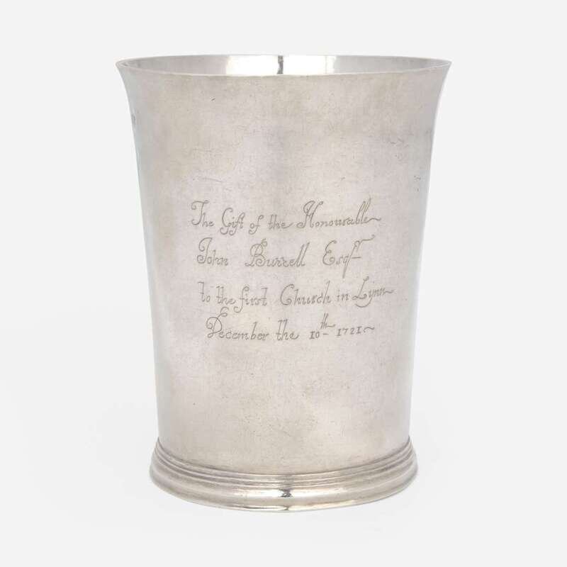 Flared rim, molded base, engraved, "The Gift of the Honourable/ John Burrell Esqr/ to the First Chuch in Lynn/ December the 10th 1721," marked twice, "AT," near rim.