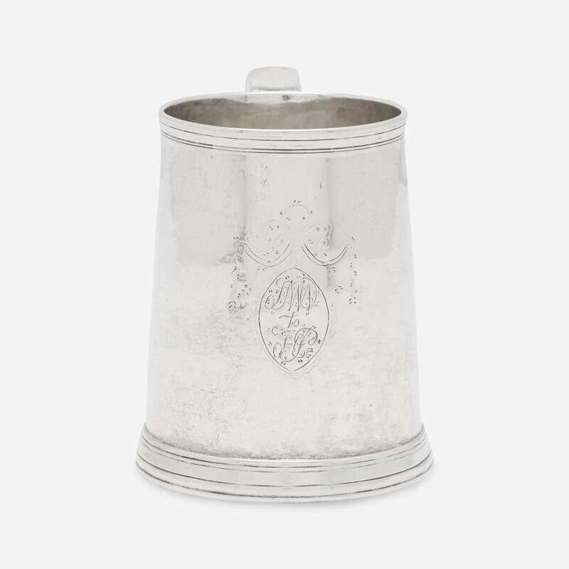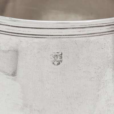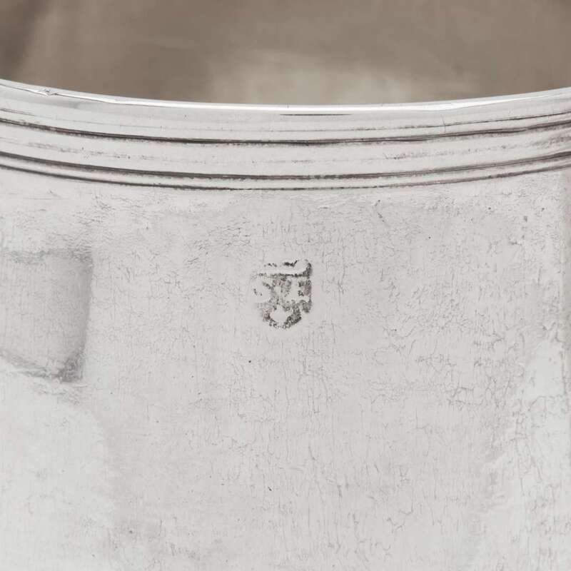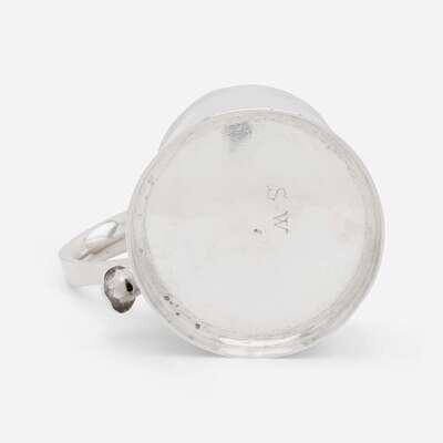 Tapered body, scrolled handle, the front engraved with navette-form reserve with monogram "SW to HP", surmounted by swagged ribbon, the underside engraved with monogram "SW," marked "SE" near rim.