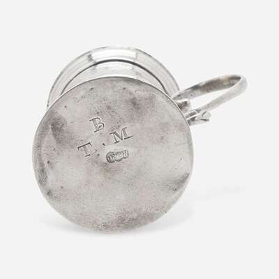 Tapered round body, molded base, pierced domed lid with finial, scrolled handle, engraved with monogram to underside, "B/ TM," marked to underside, "I HURD."