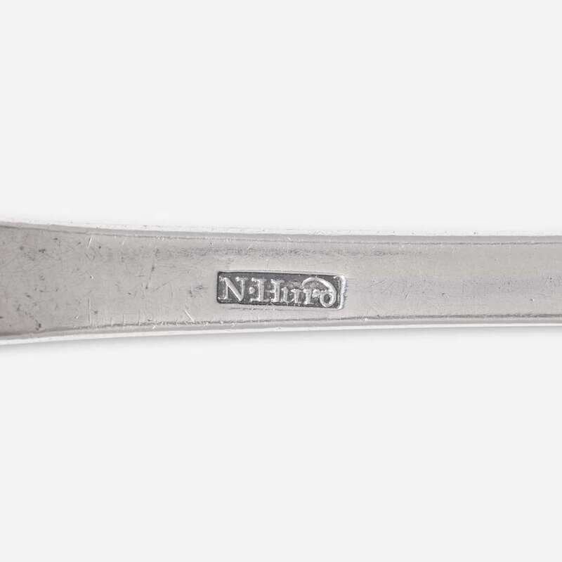 "Hanoverian" form, with single drop at bowl back, engraved with monogram, "M/ JM," to back of handle end, marked, "I Hurd," to back of handle.