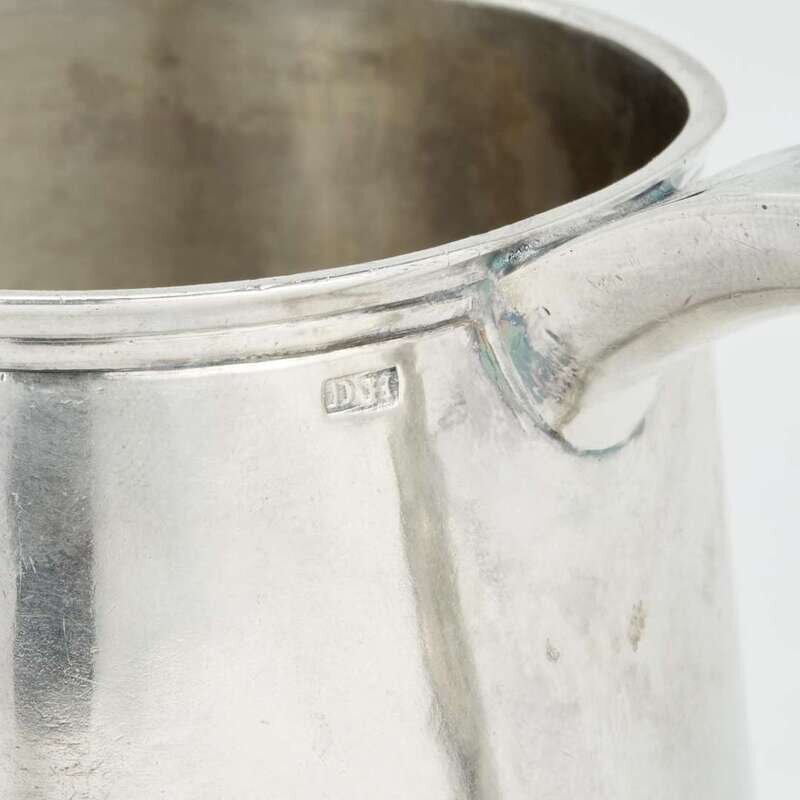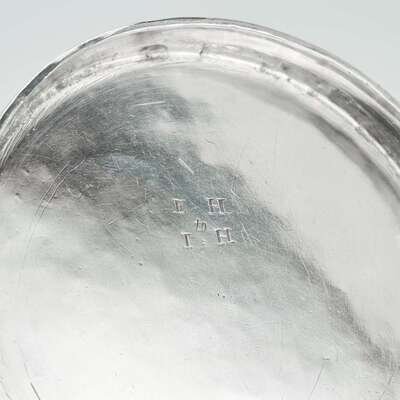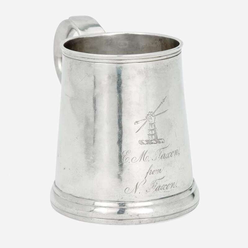 Tapered body, scrolled handle, molded base, engraved armorial crest to front in the form of a clenched fist holding pointed implements, above engraved inscription, "E.M. Faxon, from N. Faxon," engraved to underside, "EH to IH," marked "DH" near rim.