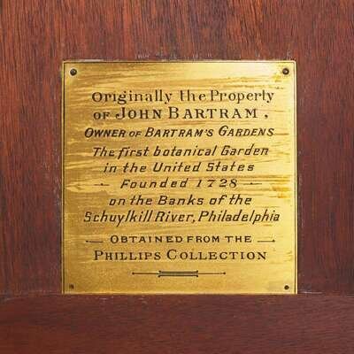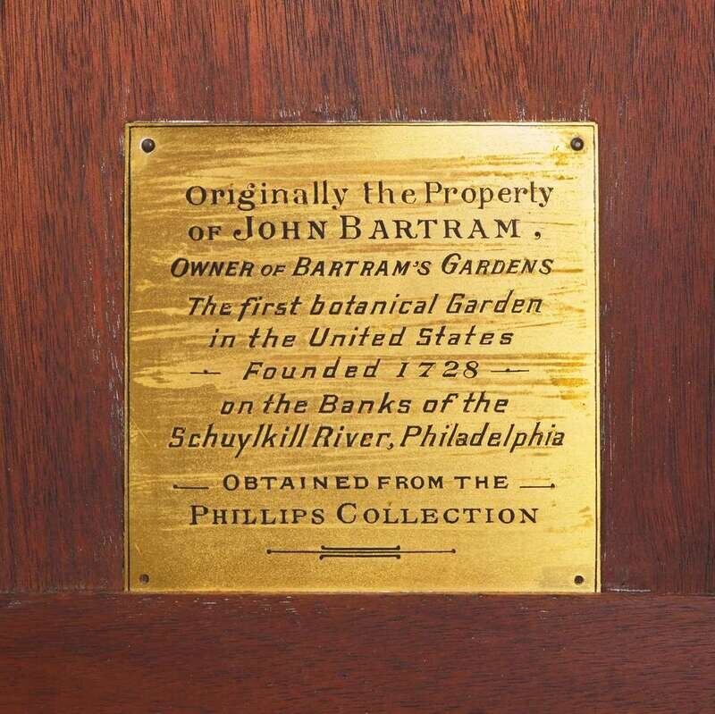 The upper section with shaped paneled doors enclosing a fitted interior, one door interior with brass plaque engraved, "Originally the Property/ of John Bartram/Owner of Bartram's Garden/The first botanist Garden/ in the United States/Founded 1728/on the Banks of the/ Schuylkill River, Philadelphia/Obtained From the/Phillips Collection," the lower section slant lid opens to drawers, pigeon holes and covered well.