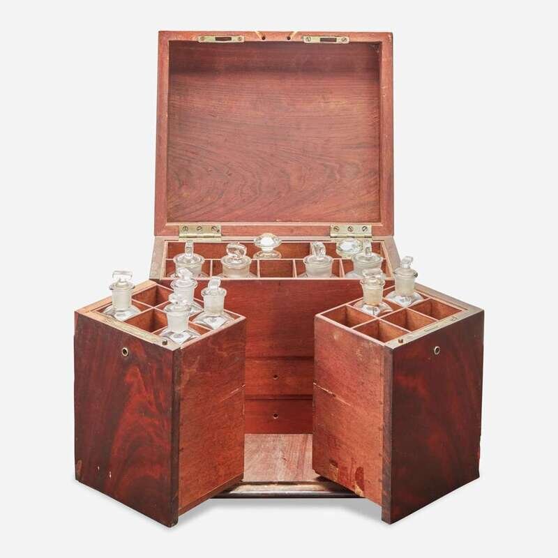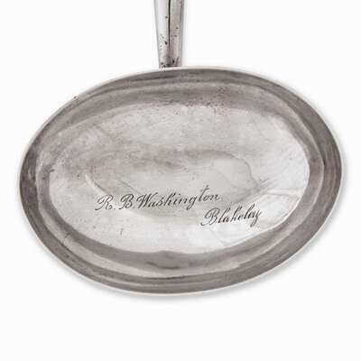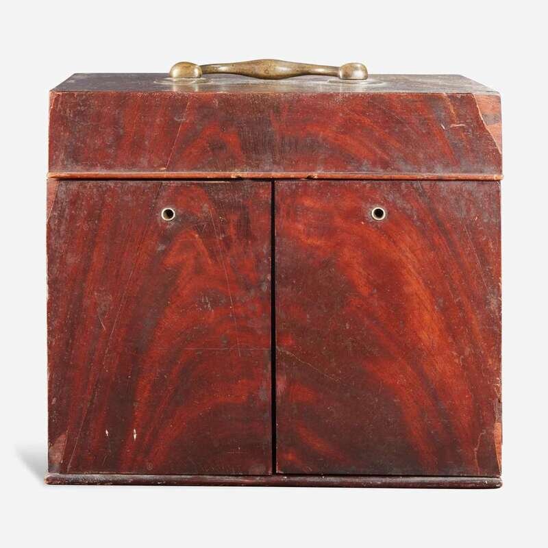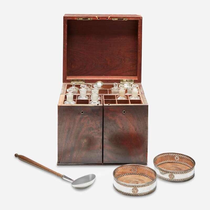 Washington Family associated items: pair of bottle sliders, punch ladle and portable mahogany medicine chest associated with Dr. Samuel Walter Washington The medicine chest probably England, late 18th / early 19th century