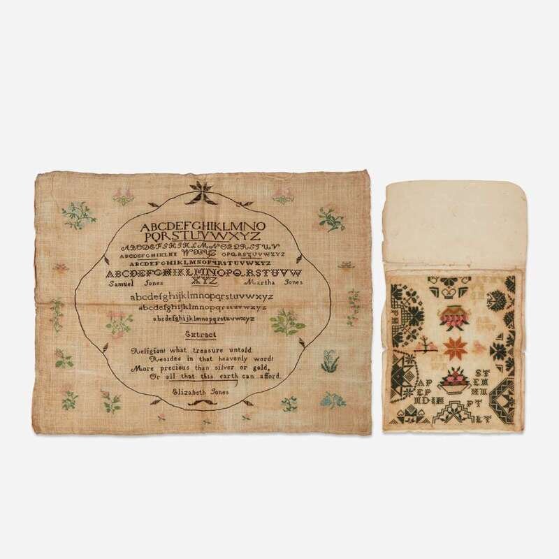 The first, inscribed "Elizabeth Jones," "Samuel Jones" and "Martha Jones," worked with floral sprigs enclosing reserve with alphabet, religious verse, silk threads on linen ground basted to original backing paper; together with an Ackworth School-patterned sampler, silk threads on linen ground basted to original paper backing, with alphabet inscribed on verso.
