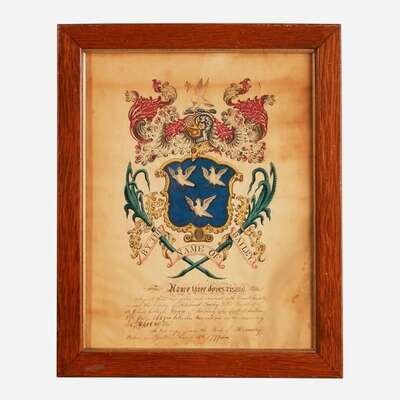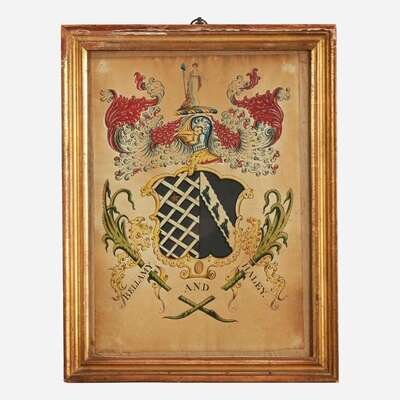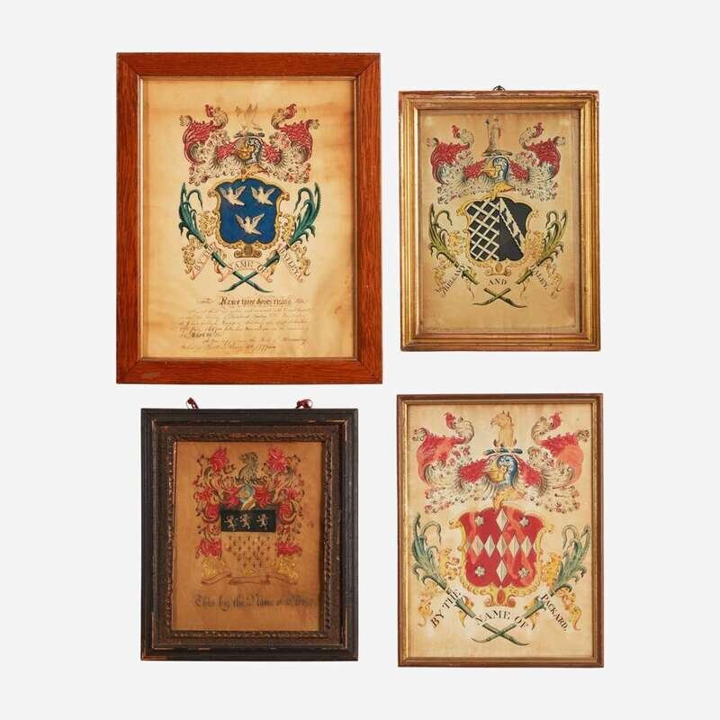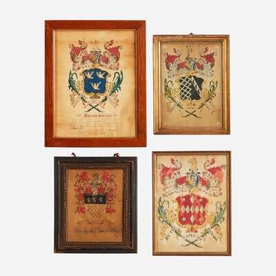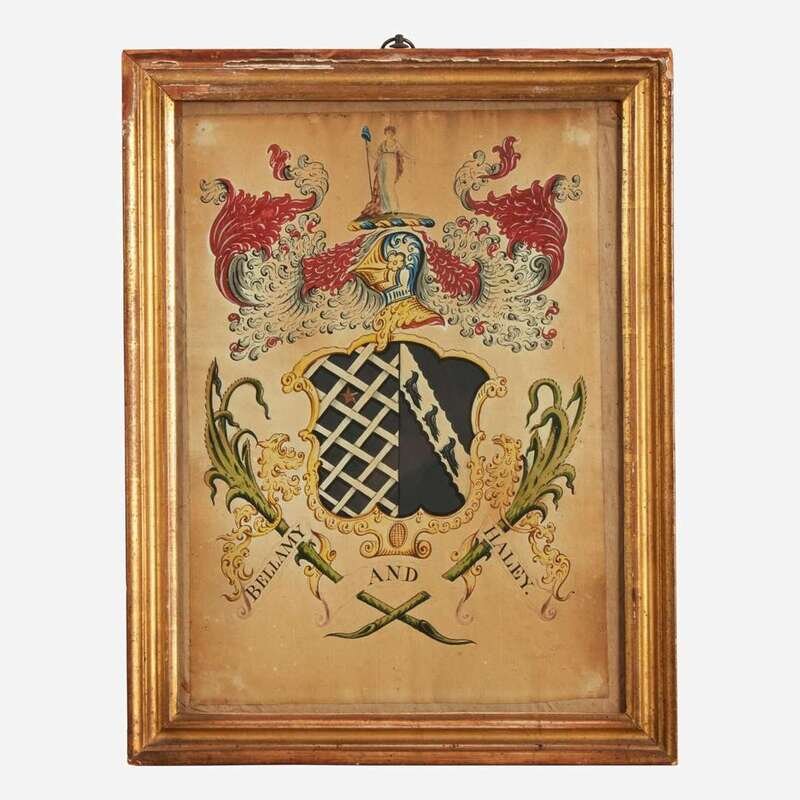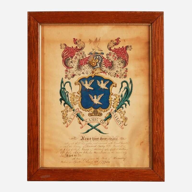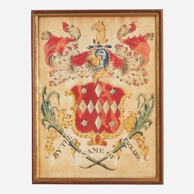 Comprising a rare coat-of-arms for The Bellamy and Haley family, attributed to John Coles, Sr. (1749-1809), circa 1806; one inscribed, "By the Name of Bailey...A true copy from the Book of Heraldry taken in Boston, March 16th 1799;" one inscribed, "By the Name of Packard;" and one inscribed, "This by the Name of Oliver," attributed to Samuel Blyth (1744-1795), circa 1775; all watercolor and/or ink on paper, framed.