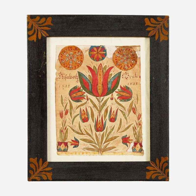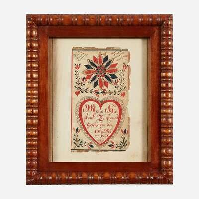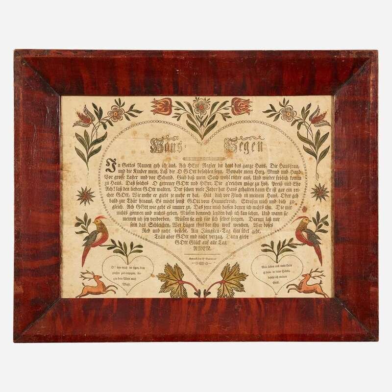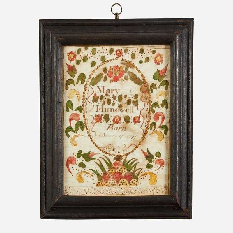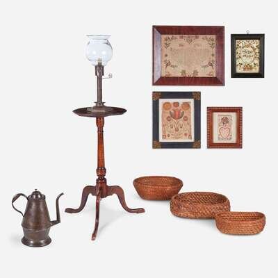 Comprising a Queen Anne carved and turned tiger maple candlestand, likely New England; a tin punchwork coffeepot decorated with potted flowers, Pennsylvania; an adjustable tinware lamp with blown glass shade; three woven rye baskets; three fraktur birth records: the first with oval roundel inscribed and dated, "Mary Hunewell/ Born November 11 1779," surrounded by floral motifs, ink and watercolor on paper, framed, the second inscribed and dated, "Elizabeth Grub 1832," depicting tulips surmounted by three compass circle patterns, framed, and the third inscribed and dated, "Maria Diestrand s estrament gesehriben den 10 ren Marz, 1846," decorated with floral motifs, ink and watercolor on paper, framed, all possibly Lancaster County, Pennsylvania; and a printed and hand-colored fraktur house blessing, Samuel Bauman (1788-1820), Ephrata, Pennsylvania, framed.