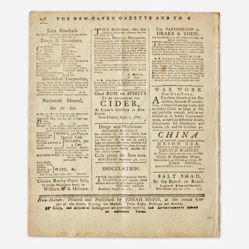 We have located only one other copy of this edition of The New-Haven Gazette newspaper that has ever come up for auction. Rare.