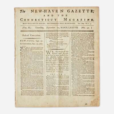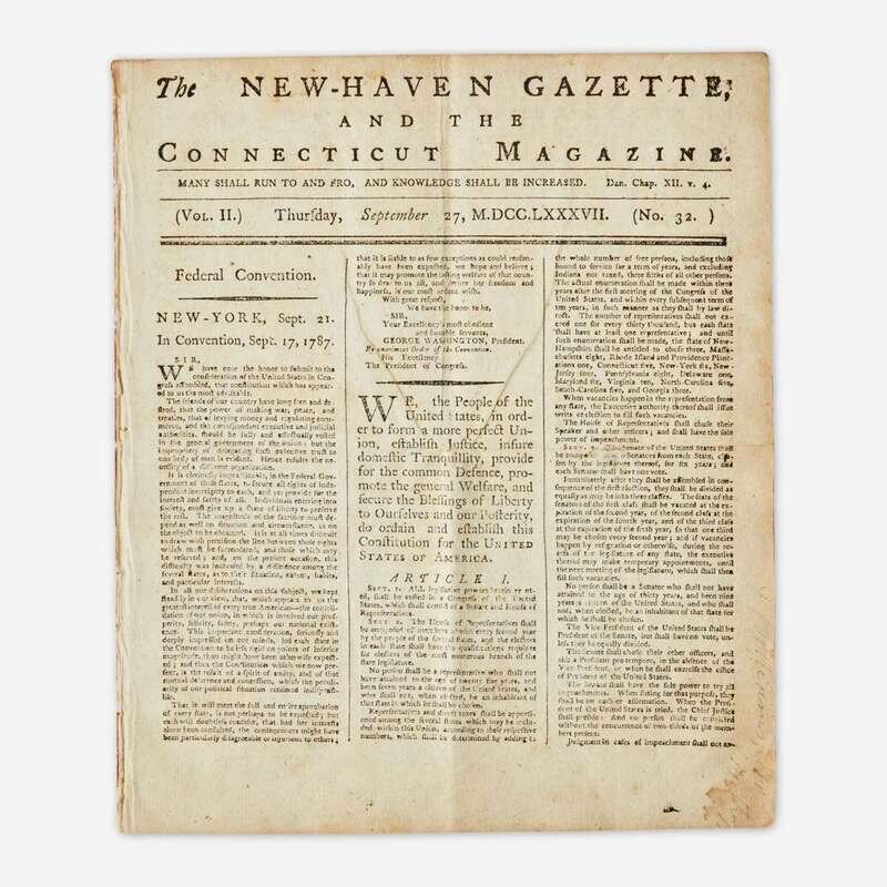 New-Haven: Josiah Meigs, Thursday, September 27, 1787. Vol. II; No. 32. 4to, 10 1/8 x 8 5/8 in. (257 x 219 mm). 8 pp., paginated (249)-258 (last two pages misnumbered). Printed newspaper, featuring the earliest available and complete Connecticut printing of the United States Constitution. The Constitution is printed in full on the first three pages, with the Preamble printed in large type front and center on the first page, and is signed in type by George Washington and the 38 signing delegates. The Constitution is preceded by a printing of George Washington's letter transmitting the document to Congress, and is followed by a printing of the Constitutional Convention's resolution for ratification, as well as an opinion article in support of adopting the text. Further, on p. 254 is an article on the Constitution's reception in Pennsylvania, in which Benjamin Franklin's famous September 17th Convention speech is mentioned. Disbound, with some residue along spine; creasing from original folds; edges slightly trimmed; small dampstaining at bottom corner of first leaf, faint inscription at same; in full red calf folding case. Evans 20563