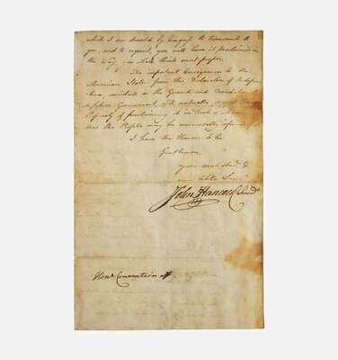 Philadelphia, July 8, 1776. Manuscript letter, signed by John Hancock as President of the Continental Congress, and inscribed by him "Honl Convention of (Georgia)", body in a secretarial hand, likely that of Jacob Rush. Silked; creased from old folds; scattered staining; scattered chipping in edges and separations along folds; abrasion at bottom verso, removing "Georgia". Two pages on one leaf, 12 5/8 x 8 in. (322 x 204 mm), with detached second blank leaf.