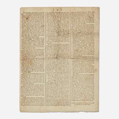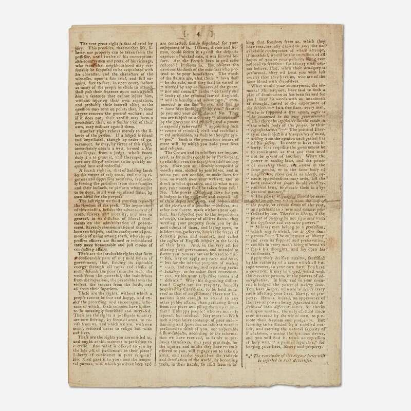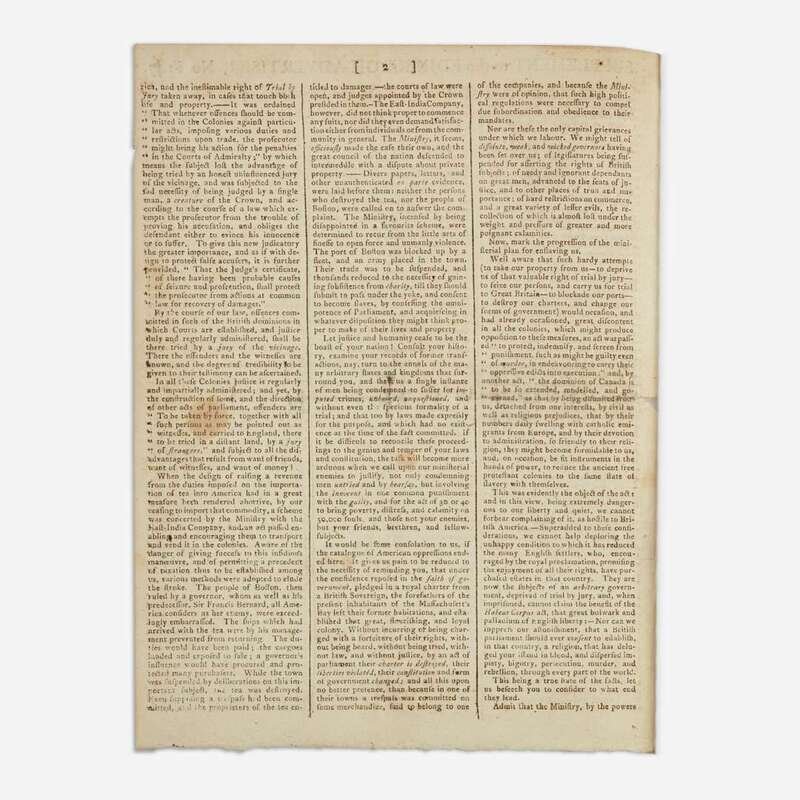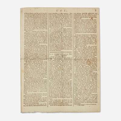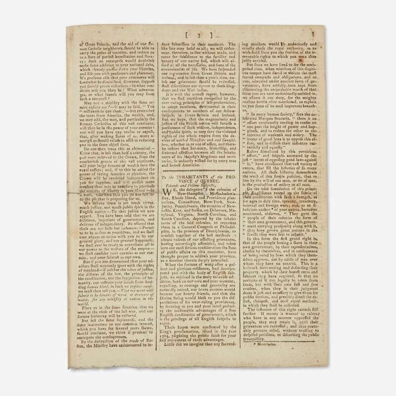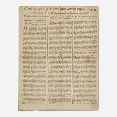 A rare supplement of the Edinburgh Advertiser, printing two of the five official messages issued by the First Continental Congress: John Jay's Address to the People of Great Britain, as well as the first part of John Dickinson's Letter to the Inhabitants of the Province of Quebec. These two letters were composed in response to the British Parliament’s passing of the Intolerable Acts (known as the Coercive Acts in Great Britain) in April 1774, following the Boston Tea Party, that curtailed American Colonists' rights and inflamed tensions between the Colonies and Great Britain. Six months after these letters were issued the first shots of the American Revolution rang out at Lexington and Concord. In The Literary History of the American Revolution, American historian Moses C. Tyler (1835-1900) references the occasion of this printing, saying ''the [Continental] Congress sent forth a series of state papers, which proved to be writings of extraordinary dignity, nobility, and force...Thus, immediately after their arrival in Great Britain, the 'Edinburgh Advertiser' for December 23, 1774, printed them in a supplement, and at the same time declared...they 'have given more real uneasiness than all the other proceedings of the Congress...''' (p. 330-331)