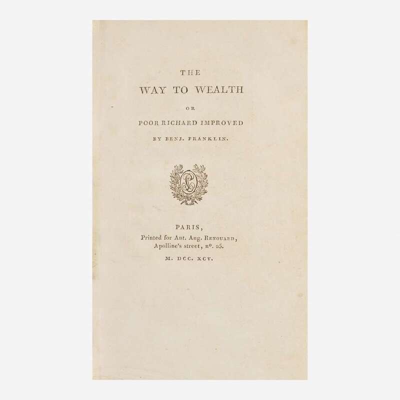 Paris: Printed for Ant. Aug. Renouard, 1795. 12mo; 6 3/4 x 4 3/8 in. (171 x 111 mm). (iv), 181, (5), 31 (ads) pp. Printed in French and in English; with an additional title-page in French. Illustrated with an engraved frontispiece portrait of Franklin, by A. Tardieu after Duplessis. Quarter red morocco over marbled paper-covered boards, stamped in gilt, extremities, joints, and boards rubbed, spine darkened, spine head chipped; marbled edges; marbled endpapers; small book-plate on front paste-down; small open tear, center pp. 43/44. Ford 135; Sabin 25596