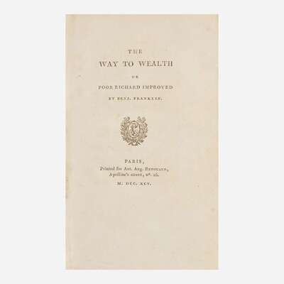 This bilingual edition of Franklin's popular aphorisms features a French translation by Antoine-François Quétant (1733-1823). While not the first French translation of some of Franklin’s writings--in 1773, Jacques Barbeu-Dubourg (1709-1779) published a translation of some of Franklin’s works, as Œuvres de M. Franklin, Docteur es Loix--in 1777, Quétant published a new translation of The Way to Wealth as La Science du Bonhomme Richard, ou Moyen facile de payer les impôts. This edition, considered by Ford "The prettiest edition yet printed," also contains Franklin's letter to a "Madame **" Passy, dated 1778, as well as the "Dialogue entre la goutte et Franklin," the poem "Le Sage et la goutte," and the essay "Quelques mots sur l'Amérique, avis à ceux qui voudroient aller s'établir dans cette contrée." "Dr. Franklin's Epitaph" is printed in both English and French at rear, and this copy includes the two publisher's catalogues only found in some copies. The separately paginated "Observations sur les Sauvages du Nord de l'Amerique," which according to Ford is only found in some copies, is not printed here.