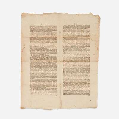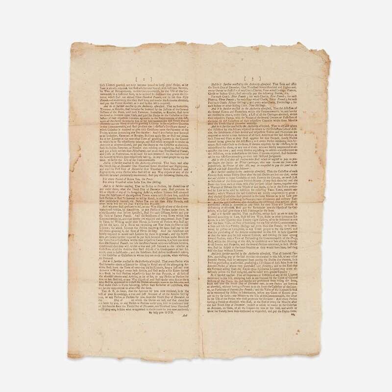 A rare printed act from the Commonwealth of Massachusetts for an excise tax on wine, rum, and other distilled spirits, as well as tea, and coaching and carriage vehicles. Passed on November 1, 1781, and taking effect on December 10 of the same year, this excise bill sought to raise much needed revenue for the state to meet interest charges on debt incurred during the American Revolution. Taxes on wine, rum, brandy, and other goods, would not only hopefully meet these fiscal demands, but as an additional benefit, according to the bill, it would suppress "Immorality, Luxury and Extravagance in this Commonwealth." As historian Van Beck Hall writes, "The debate over and the voting on the excise act divided both the commercial-cosmopolitan interests and their opponents. Many merchants and tradesmen, who either did not hold securities or who had invested in Continental paper, did not favor an excise that would raise prices. At the other extreme, many poorer farmers accepted the excise as a means of avoiding direct taxes on land, property, and polls." (Politics Without Parties: Massachusetts, 1780-1791, 1972). The bill proved difficult to enforce, and over the years following its passage, it was amended, while other excise bills were passed on other goods.