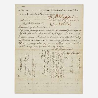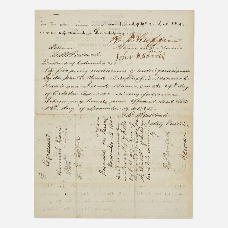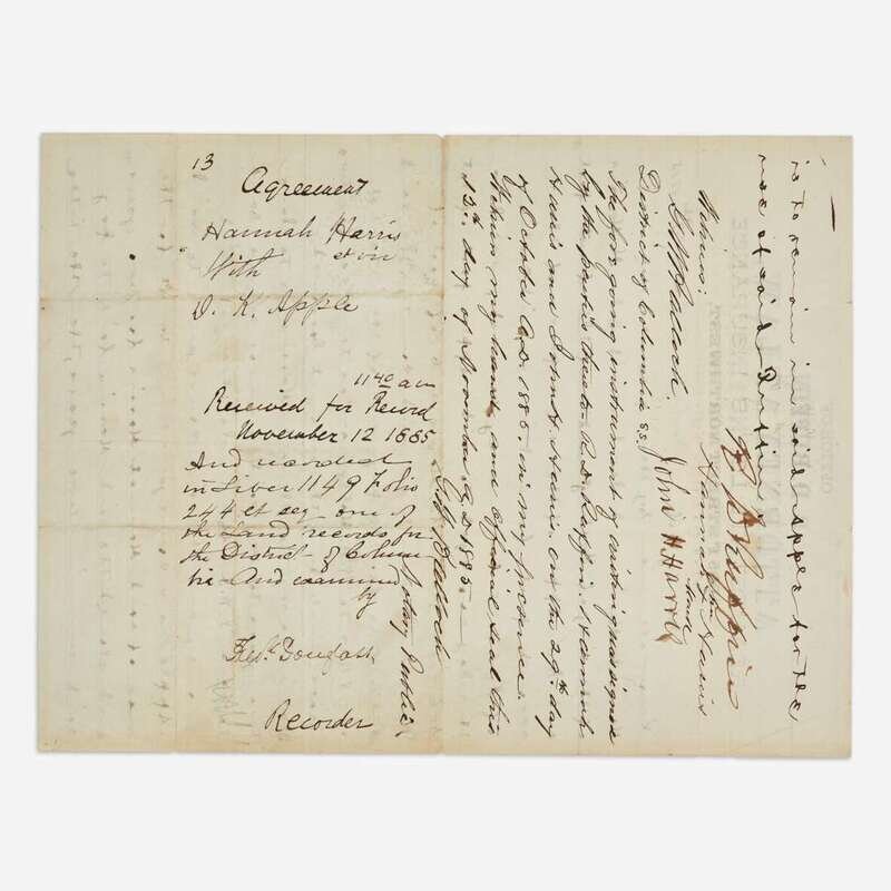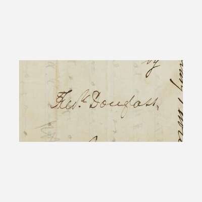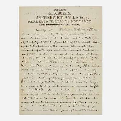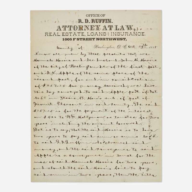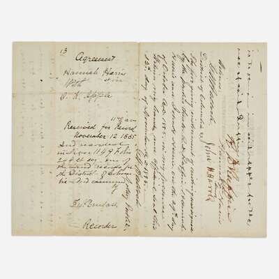 Washington, D.C., Oct(ober) 29, 1885. One sheet, 10 1/2 x 8 in. (267 x 203 mm). Partially-printed real estate document on R.D. Ruffin. Attorney at Law, Real Estate, Loans and Insurance stationery, between Hannah and John Harris and D.K. Apple, executed in a secretarial hand, and signed on verso by Frederick Douglass as the Recorder of Deeds for Washington, D.C. ("Fredk. Douglass"); signed on verso by notary public, G.W. Balloch, and with his embossed stamp; docketing to same. Creasing from contemporary folds; scattered minor edge-wear. In mat and in frame, with a printed photo of Douglass; 24 1/2 x 15 1/2 in. (622 x 394 mm).
