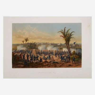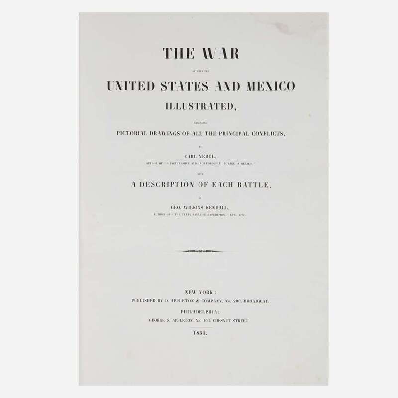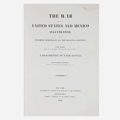 A landmark book of lithographic illustration and one of the most important works on the Mexican-American War (1846-48). The Mexican-American War was the first foreign conflict extensively covered by U.S. journalists, and George Wilkins Kendall (1809-67) was one of its most important chroniclers. Considered America's first war correspondent, Kendall was an ardent supporter of war with Mexico, and when hostilities broke out in 1846, he immediately made his way to the Rio Grande and joined the Texas Rangers. He saw combat in the Battle of Monterrey (September 21-24, 1846) and traveled with General William Jenkins Worth, and later attached himself to the company of General Winfield Scott. By the end of the war he had written over 200 first-hand reports, many of which were printed in The New Orleans Picayune, which he co-established and co-edited. For this volume's text, Kendall culled from official military reports, and the illustrations, each depicting a scene from a key battle, were completed by German artist Carl Nebel. According to Kendall in his preface, the twelve illustrations by Nebel were based on drawings that were executed, "on the spot by the artist," and, "as regards the general configuration of the ground, fidelity of the landscape, and correctness of the works and buildings introduced, they may be strictly relied upon." The volume was published concurrently by the Appletons in New York and Philadelphia, and the plates were produced by Lemercier in Paris, as both Kendall and Nebel believed they should be executed by the finest printers available. They both spent time in Paris overseeing the production, and personally financed the printing.