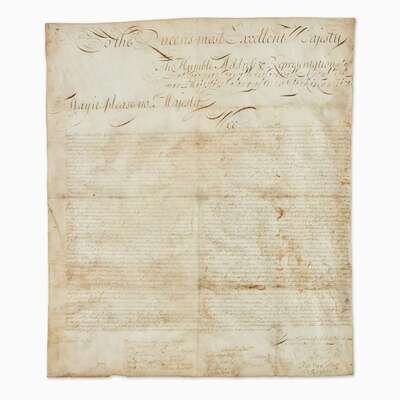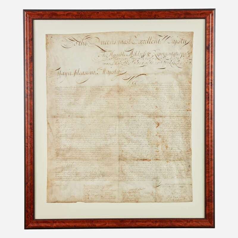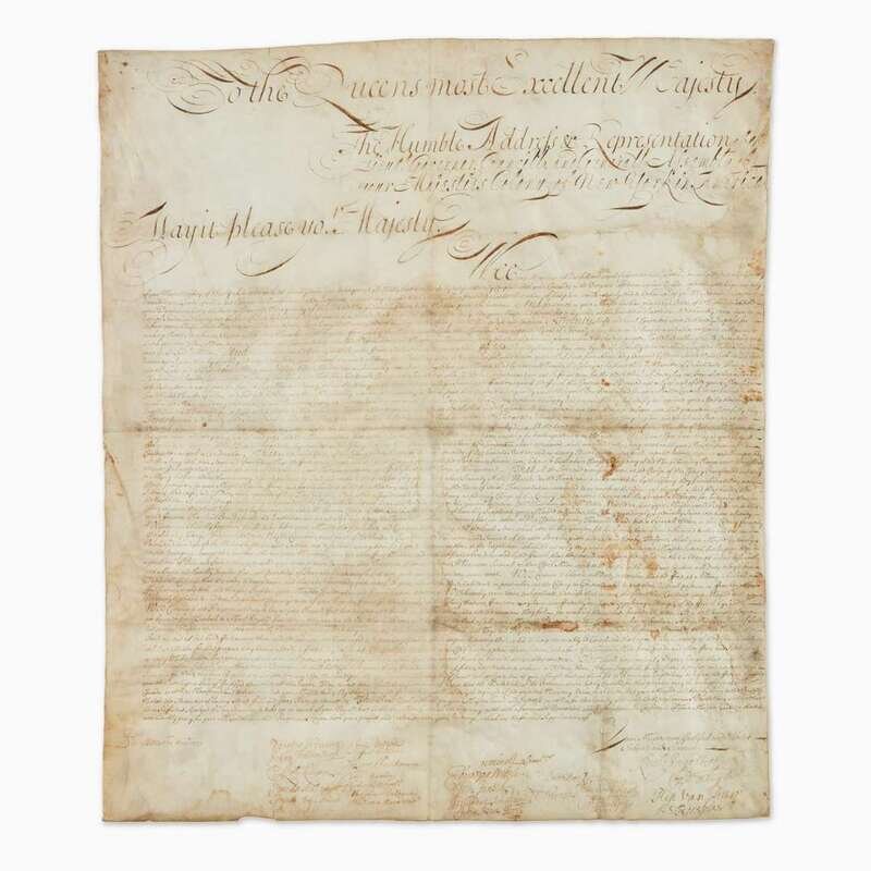 An important and possibly unique early colonial document, being a petition adopted by the Assembly of the Colony of New York, and presented to Queen Anne of Great Britain (1665-1714), seeking reimbursement for expenses and resources provided by them for a failed military adventure to conquer French Canada during Queen Anne's War (1702-13).