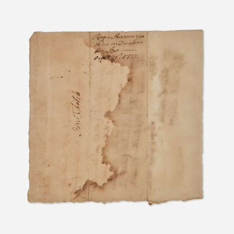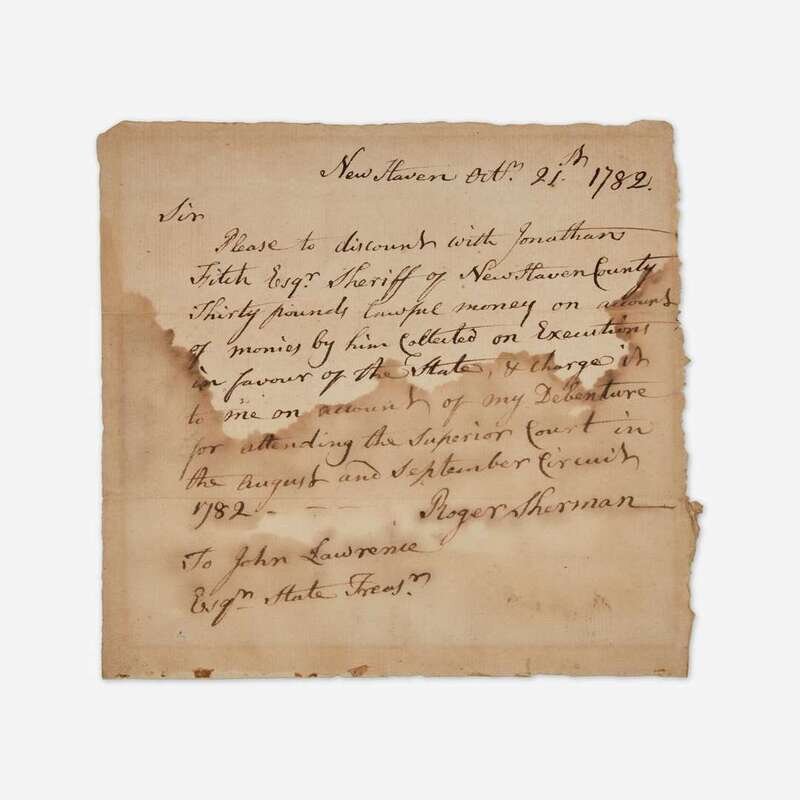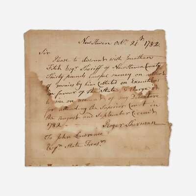 New Haven, Oct(ober). 21, 1782. One sheet, 6 1/4 x 6 3/4 in. (159 x 171 mm). Autograph letter, signed by Roger Sherman to Connecticut State Treasurer, John Lawrence, to "discount with Jonathan Fitch Esqr. Sheriff of New Haven County Thirty pounds lawful money on account of monies by him Collected on Executions in favour of the State, & charge it to me on account of my Debenture for attending the Superior Court in the August and September Circuit 1782"; docketed on verso, likely in Lawrence's hand, likely endorsed by Fitch on same. Creasing from old or contemporary folds; dampstaining in bottom half.