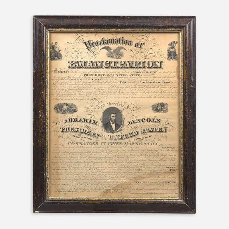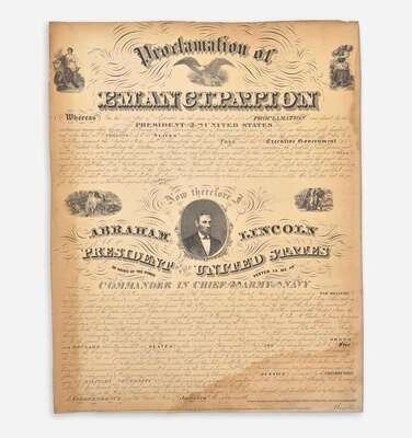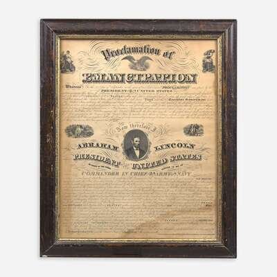 Charles Eberstadt, in his Lincoln's Emancipation Proclamation (New York, 1950), records six overall printings with A. Kidder's design of Abraham Lincoln's Emancipation Proclamation, either engraved or lithographed, that were published in both Chicago and New York, and include four broadsides (Nos. 26-29), and two miniatures (Nos. 24-25). This copy is an unrecorded variant printing of Kidder's design. This copy was likely printed sometime after Kidder's 1864 New York edition (Eberstadt 28), and sometime before his 1865 Chicago edition (Eberstadt 29). This copy retains Lincoln's printed facsimile signature that, according to Eberstadt, was later omitted in the 1865 Chicago printing. Kidder's later Chicago address "98 Washington St" is printed on this copy, and its four vignettes match the later Chicago printing (Eberstadt 29). The earlier New York printing has his Chicago address at "86 Dearborn St", and features different vignettes.