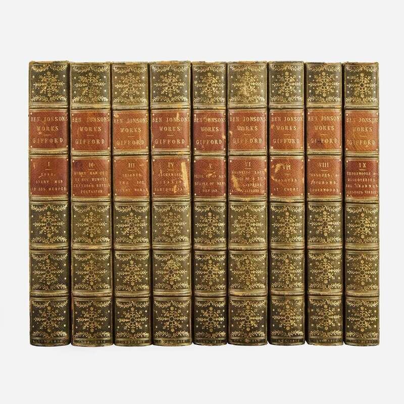 London: Printed for G. and W. Nichol, F.C. and J. Rivington, et al., 1816. In nine volumes. 8vo. From the library of George John Warren Venables-Vernon, 5th Baron Vernon (1803-66), and with his gilt supralibros on front and rear boards of each volume. Illustrated with an engraved frontispiece portrait of Jonson by J. Fittler, after W. Behnes. Contemporary full green morocco, stamped in gilt, brown morocco spine labels, front and rear joints rubbed, chipping and rubbing to spine ends and some spine labels, spines faded; all edges gilt; gilt dentelles; marbled endpapers; by Charles Lewis, and with his handsome morocco binder's ticket on front paste-down of fist volume; foxing to frontispiece, offsetting onto title-page from same; scattered light foxing to some text leaves.