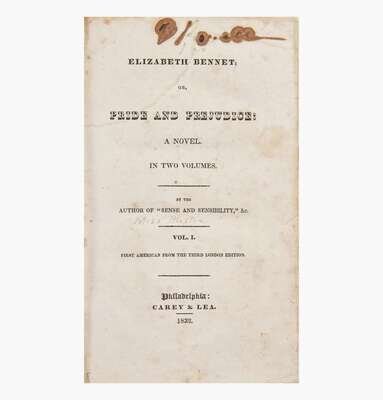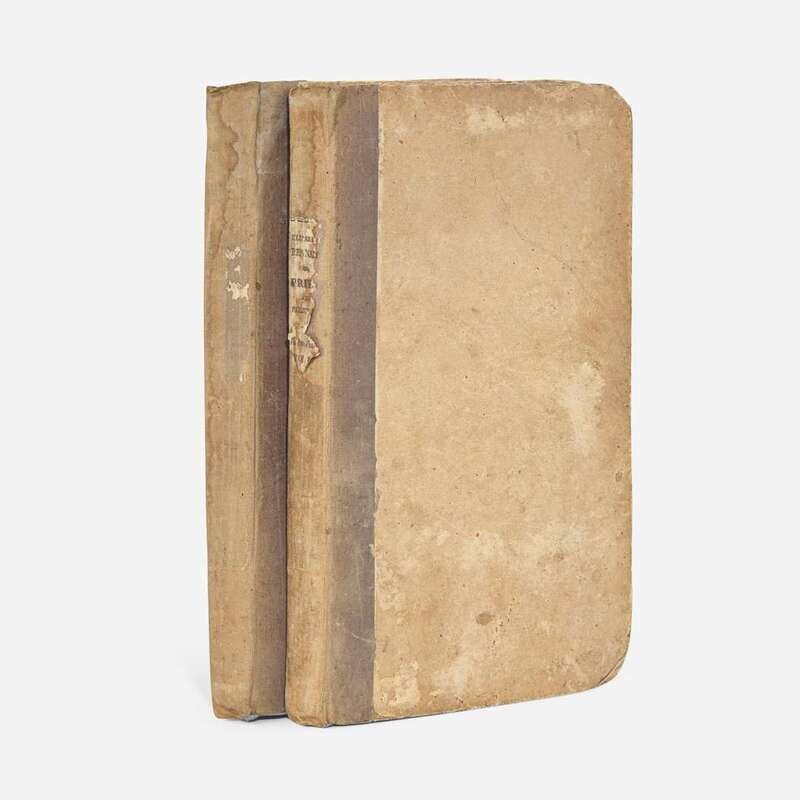 Philadelphia: Carey & Lea, 1832. In two volumes. First American edition (one of only 750 copies printed). 8vo. (1-2) (ads), (3)-199; 209 pp. Publisher's quarter brown cloth over drab paper-covered boards, extremities and boards worn and soiled, dampstaining along spines; original paper spine label on first volume wanting, label on second volume heavily chipped; all edges untrimmed; "Miss Austin" (sic) penciled on both title-pages; moderate to heavy spotting and dampstaining to text; contemporary ownership signature on front paste-down on first volume, both title-pages, offsetting from same on several pages in both volumes; rear paste-down in both volumes partially torn away; final free leaf in second volume trimmed. Gilson B2; Keynes 10