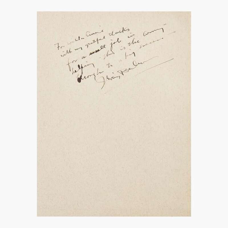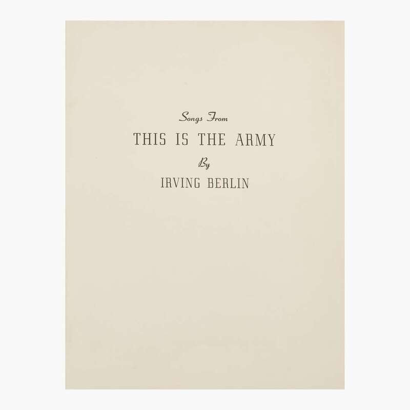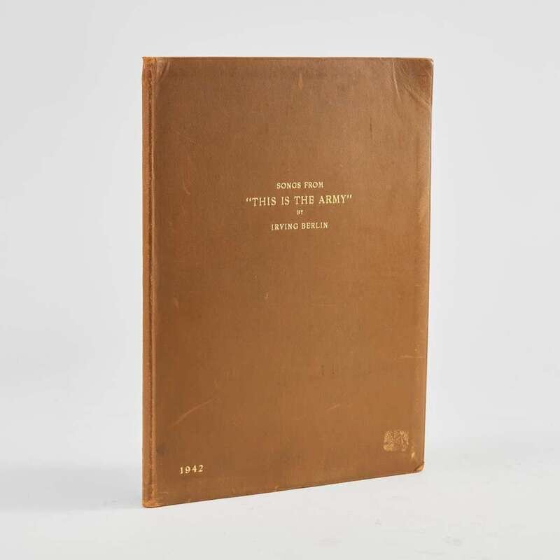 New York: This is the Army Inc., 1942. First edition. 4to. 55 pp. Presentation copy, inscribed by Irving Berlin to United States Army Colonel Walter J. Currie, Chief of the Entertainment and Recreation Division of the United States Army: "For Walter Currie/with my grateful thanks/for a swell job in/helping 'This is the Army'/through to a big success--/Irving Berlin." Original full tan flexible calf presentation binding, stamped in gilt, extremities and spine ends rubbed, scattered soiling to boards; all edges gilt; sello tape remnants on front paste-down.