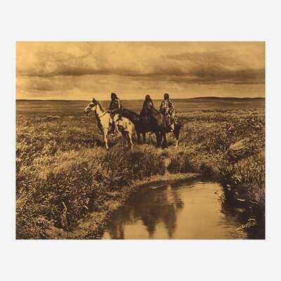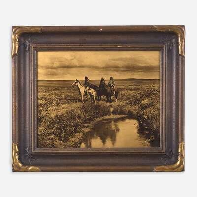 A handsome example of Curtis's most desirable image, luminously printed in his orotone printing method, and presented in its original batwing frame designed by Curtis. "A Blackfoot picture on the prairies of Montana. Rarely do we see a picture which renders so well the spirit of the prairies and plains of the great northwest." (From the mounted label on rear of frame).