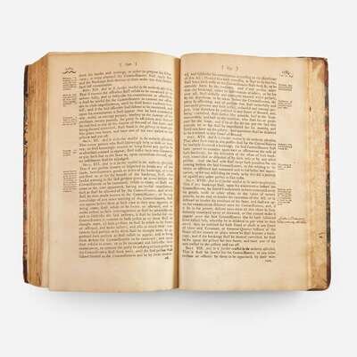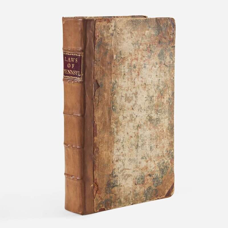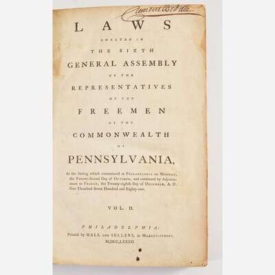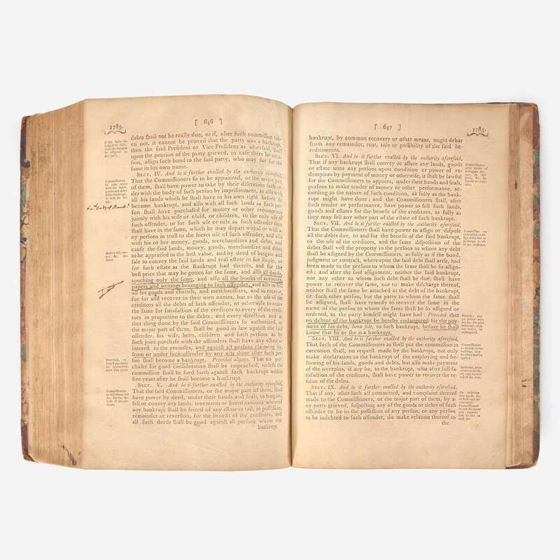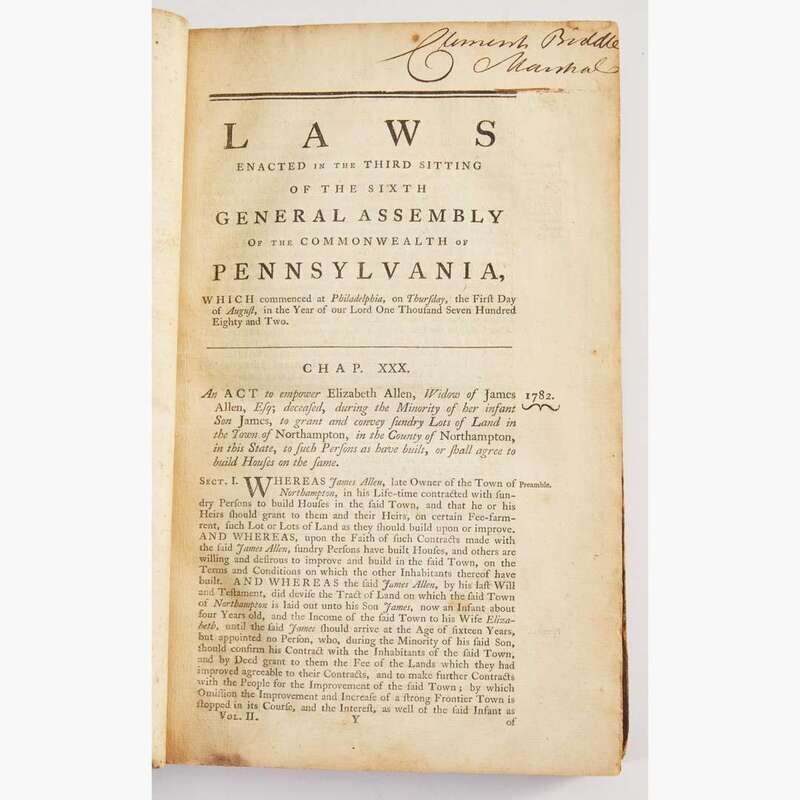 Philadelphia: Printed by Hall and Sellers, and Thomas Bradford, 1782-85. Vol. II. 368, iii, (i), 371-587, (i), iv, 589-704, iii pp. Revolutionary War soldier, Quarter-master General, and the first Marshal of Pennsylvania, Clement Biddle's copy, with his signature on front paste-down, head of title-page, p. 85: "Clement Biddle Marshal", and his marginal notes and underlining, mainly toward rear. Contemporary three-quarter brown calf over marbled paper-covered boards, rebacked, red morocco spine label, stamped in gilt, boards worn and rubbed; all edges trimmed; ownership signature of James Tate Esq., surgeon of the 3rd Pennsylvania Regiment, at head of p. 9, open tears to same; open tear, pp. 663/664; scattered light to moderate foxing. Evans 17659