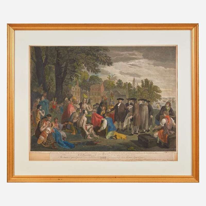 An iconic image, considered one "of the best-known prints of a Philadelphia scene" (Snyder, City of Independence, p. 252), depicting William Penn entering into the Treaty of Shackamaxon with the Lenni Lenape people. To help bolster the reputation of the Penn family, William Penn's son, Thomas (1702-75), commissioned Benjamin West to create his allegorical painting, after which John Boydell based his print.