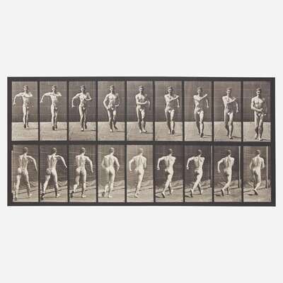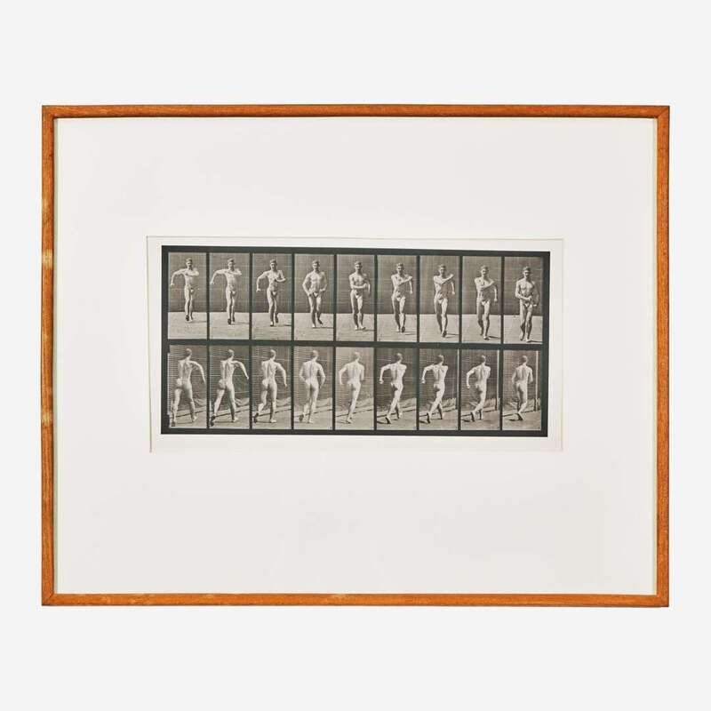 A fascinating collotype from pioneering early photographer Eadweard Muybridge's Animal Locomotion, the first scientific study to use photography. Muybridge created his Animal Locomotion photographs after partnering with the University of Pennsylvania and Philadelphia publisher J.B. Lippincott in the mid-1880s. He was given a $5,000 stipend and a studio at 36th and Pine streets in West Philadelphia, and from 1883-86, he and his team created over 100,000 photographs recording human and animal movements, often recruiting students and teachers from the University, as well as animals from the University's veterinary school and the Philadelphia Zoo. "The point of taking these photographs was, according to Muybridge, to generate 'the law governing the walk' and it is this law and this action that takes primacy in Animal Locomotion. Walking is the subject of the first fifty-eight plates...Plate 3, a fast walk, fist clenched, arms swinging..." (p. 125, Louise Hornby, Still Modernism: Photography, Literature, Film, 2017). Animal Locomotion was published in 1887 in a subscription-based portfolio, where prospective buyers could choose 100 photos from a selection of over 700, for $100.