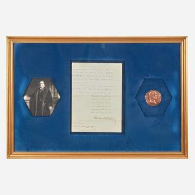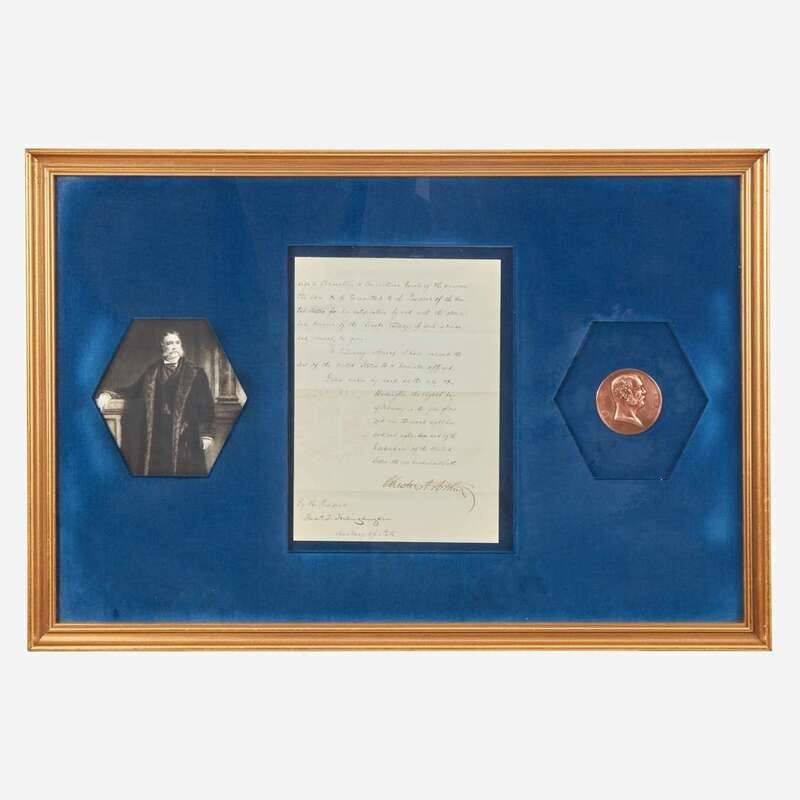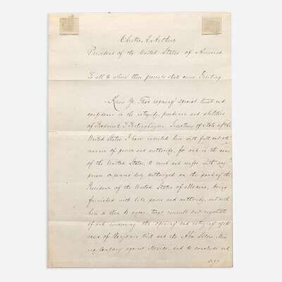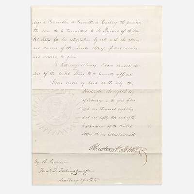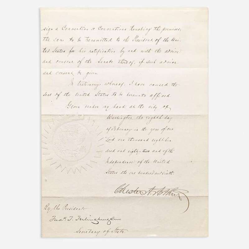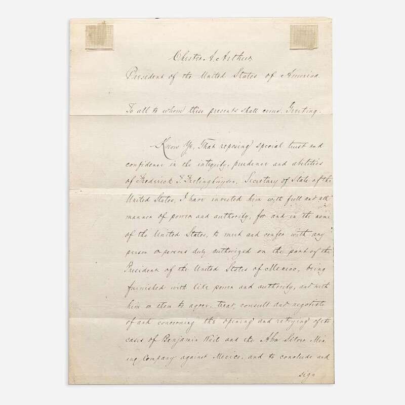Washington, (D.C.), February 8, 1882. One sheet, 13 x 9 1/2 in. (330 x 241 mm). Manuscript document, in a secretarial hand, signed by Chester A. Arthur, as President of the United States, empowering Secretary of State, Frederick Theodore Frelinghuysen, the "power and authority, for and in the name of the United States...to agree, treat, consult and negotiate of and concerning the opening and retrying of the cases of Benjamin Weil and the (La) Abra Silver Mining Company against Mexico, and to conclude and sign a Convention or Conventions touching the premises..."; counter-signed by Frelinghuysen; original white paper seal intact. Creasing from original folds. Mounted at top corners with tape, and handsomely framed with a portrait of Arthur and a presidential medallion, 23 x 34 in. (584 x 864 mm).