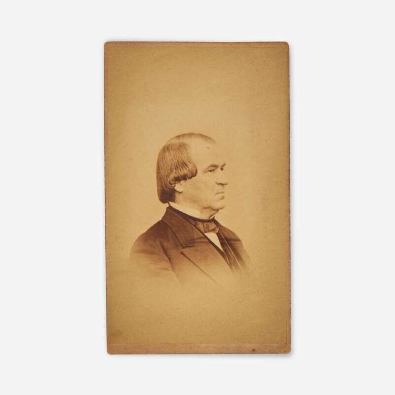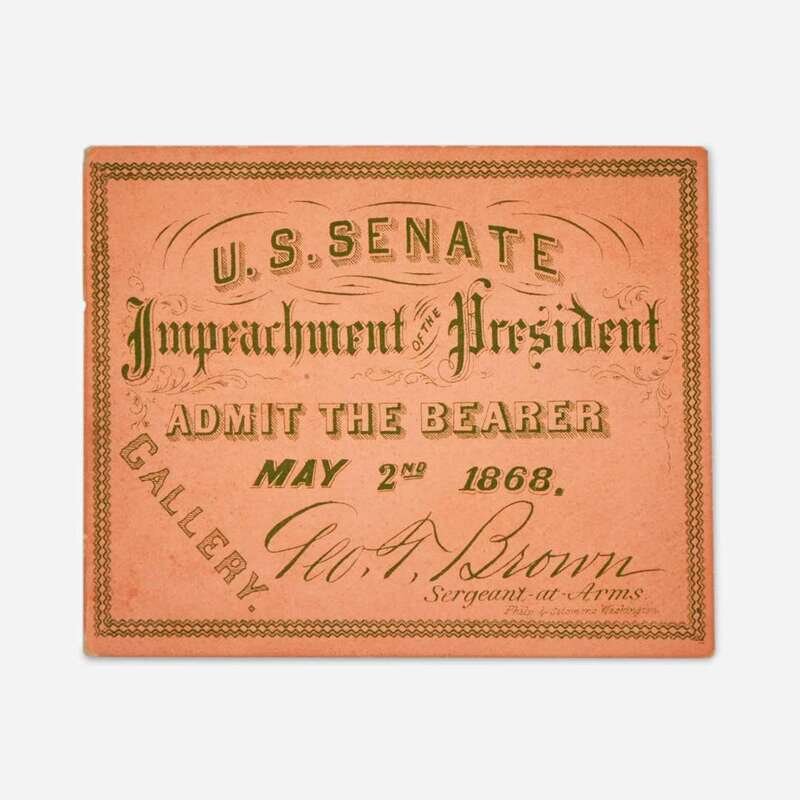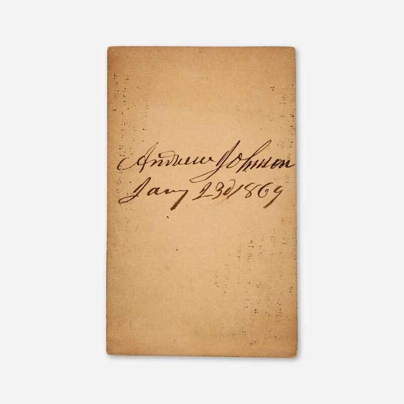 No place, Jan(uar)y 23d 1869. Carte de visite, signed by Andrew Johnson as President, on verso. 4 x 2 1/2 in. (102 x 63 mm). Lot includes a printed ticket, on orange pasteboard, to Johnson's Senate impeachment trial, dated May 2, 1868; lacking stub along left edge.