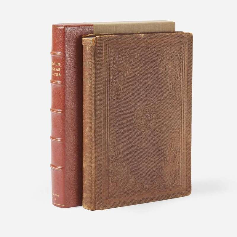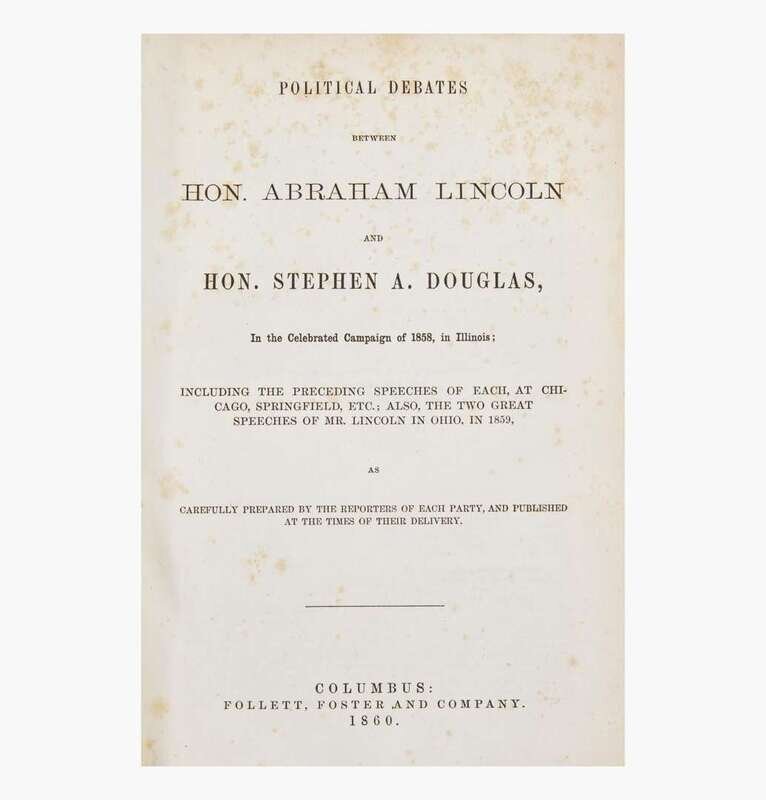 First edition of Abraham Lincoln and Stephen Douglas's famed debates, held during the 1858 Illinois senatorial campaign. Between August and October 1858, Democratic senator and incumbent Stephen Douglas, and rising Republican party star Abraham Lincoln held seven debates in the seven congressional districts of Illinois. The debates centered on the major issue of the extension of slavery into the western territories, and helped shape the national discussion over the fraught and increasingly violent issue. Thanks to technological advances like the telegraph and the expansion of the railroad, they were viewed by thousands of spectators and reported nationally. Although Lincoln lost the election to Douglas, these debates burnished Lincoln's reputation and contributed to the rise of the Republican Party. They were collected and printed in 1860 to support Lincoln's campaign for president, and became a best-seller, to the chagrin of Douglas who thought his speeches were improperly edited.