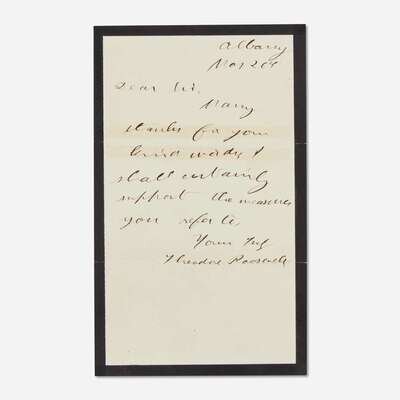 Albany, Mar(ch) 26th, (1884). One sheet folded to make four pages, 8 x 4 3/4 in. (203 x 121 mm). Autograph letter, on mourning stationery, signed by Theodore Roosevelt, as a member of the New York State Assembly, likely less than a month after the death of his first wife, Alice Hathaway Lee, and his mother, Martha Stewart "Mittie" Buloch: "Dear Sir/Many/thanks for your/kind words. I/shall certainly/support the measures/you refer to./yours truly/Theodore Roosevelt." Creasing from original folds. In fine condition.