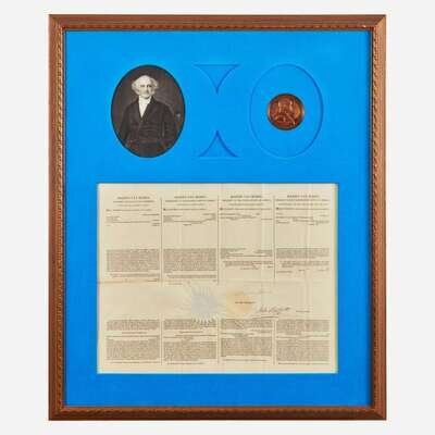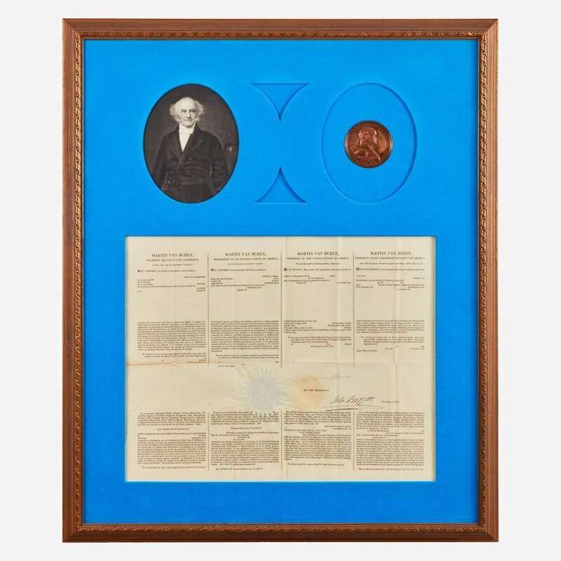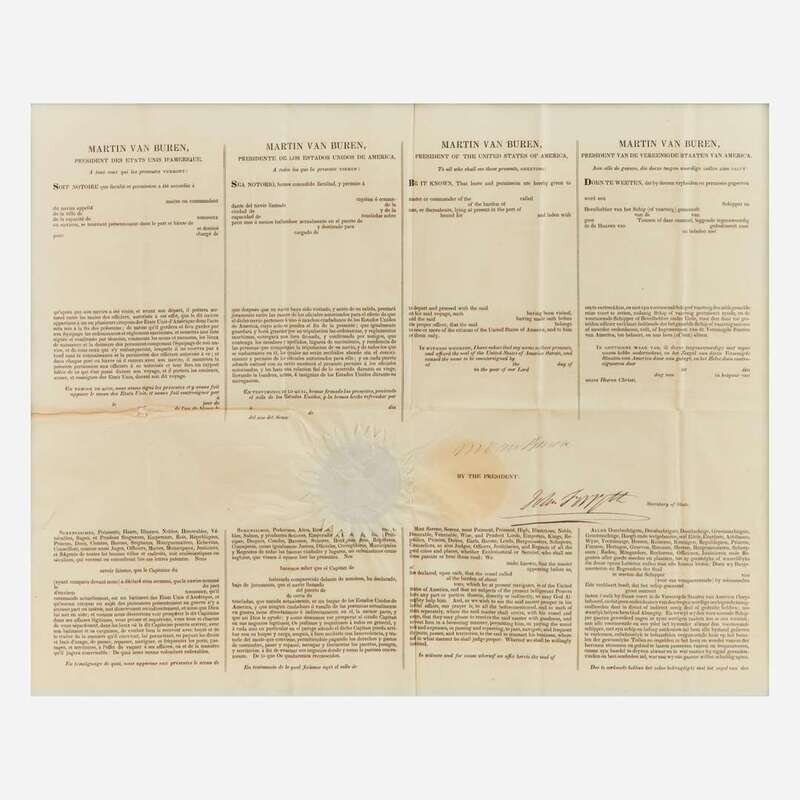 (Washington, D.C.), no date (ca. 1837-41). One sheet, approximately 16 x 20 in. (406 x 508 mm) (sight). Partially-printed and unissued, four-language ship's passport, signed by Martin Van Buren, as President of the United States; counter-signed by Secretary of State John Forsyth; white paper seal intact. Creasing from original folds, small separations in same. Unexamined out of handsome frame, with portrait of Van Buren and presidential medallion, 33 x 27 1/2 in. (838 x 698 mm). A fine example.