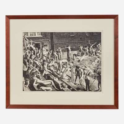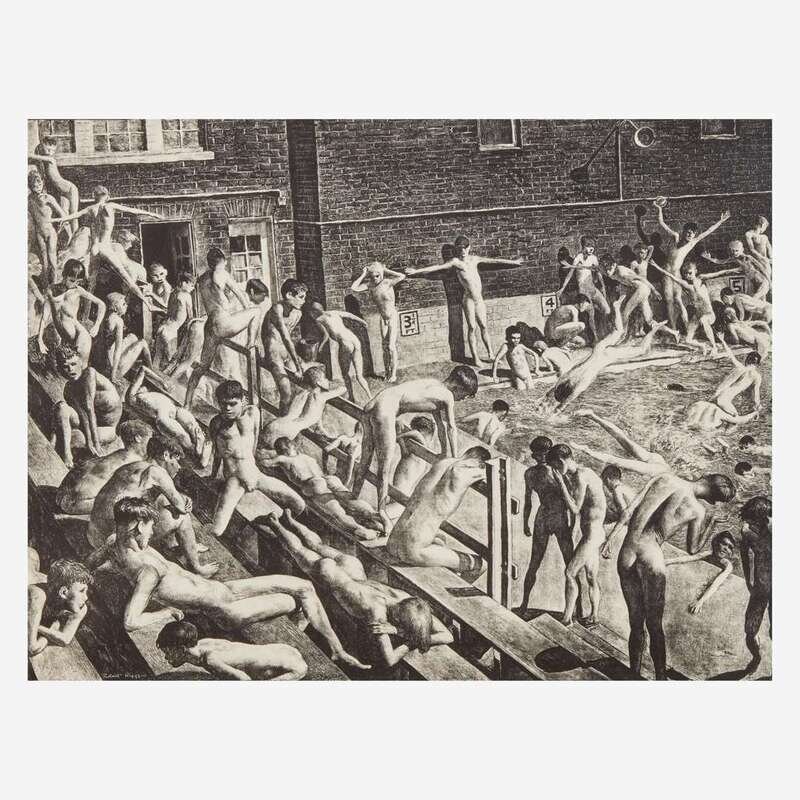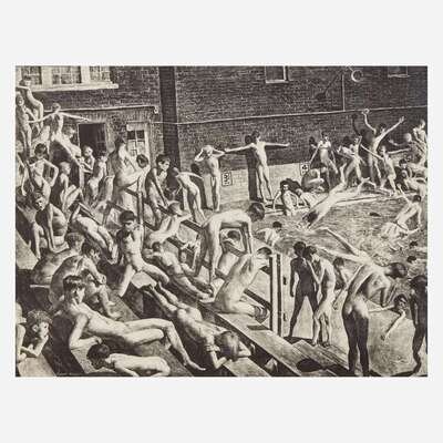 This print was likely set at the Germantown Boys Club, in Philadelphia. As Ben Bassham explains in his catalogue raisonne of Riggs's work, Riggs and other artists of the 1920s and 30s made nude male bathers a popular subject, and used the Germantown Boys Club, as well as the Y.M.C.A., as the setting of some of their prints. An excellent impression, inscribed by Riggs.