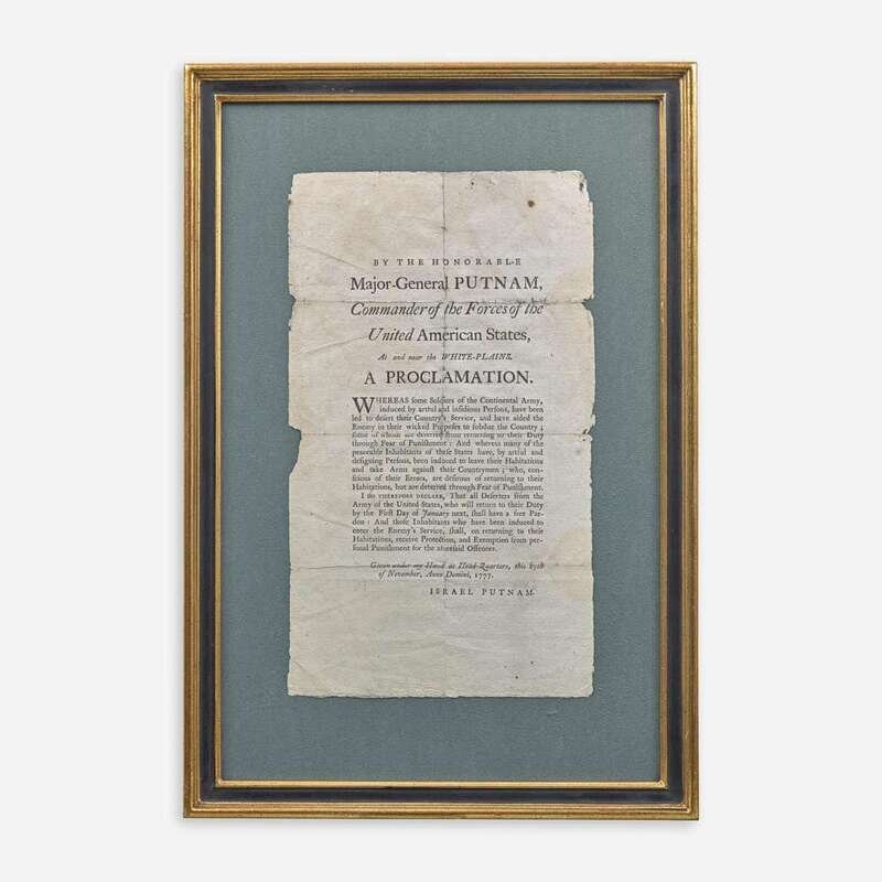Exceptionally rare broadside offering amnesty to any deserting American soldier, printed by order of General Israel Putnam (1718-1790) of the Continental Army, while stationed in New York. Putnam's proclamation offered amnesty to any soldier who had deserted if they were to return to duty before a certain date. He addressed those who had been ‘’induced by artful and insidious Persons...to desert their Country’s Service, and have aided the Enemy in their wicked Purposes to subdue the Country…’’, yet ‘’are deterred from returning to their Duty through Fear of Punishment.’’