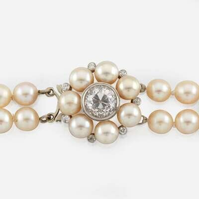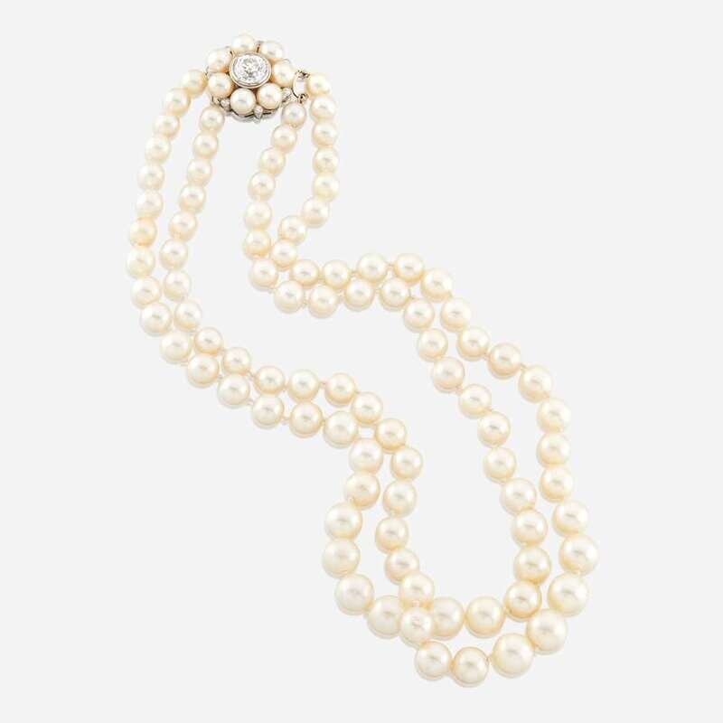 designed as a double strand of graduated cultured pearls measuring approximately 8.50 to 5.50mm, completed by 18K white gold clasp centering a bezel-set European-cut diamond weighing approximately 1.60 carats, surrounded by cultured pearls measuring approximately 5.60mm, accented by single-cut diamonds.