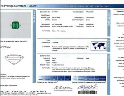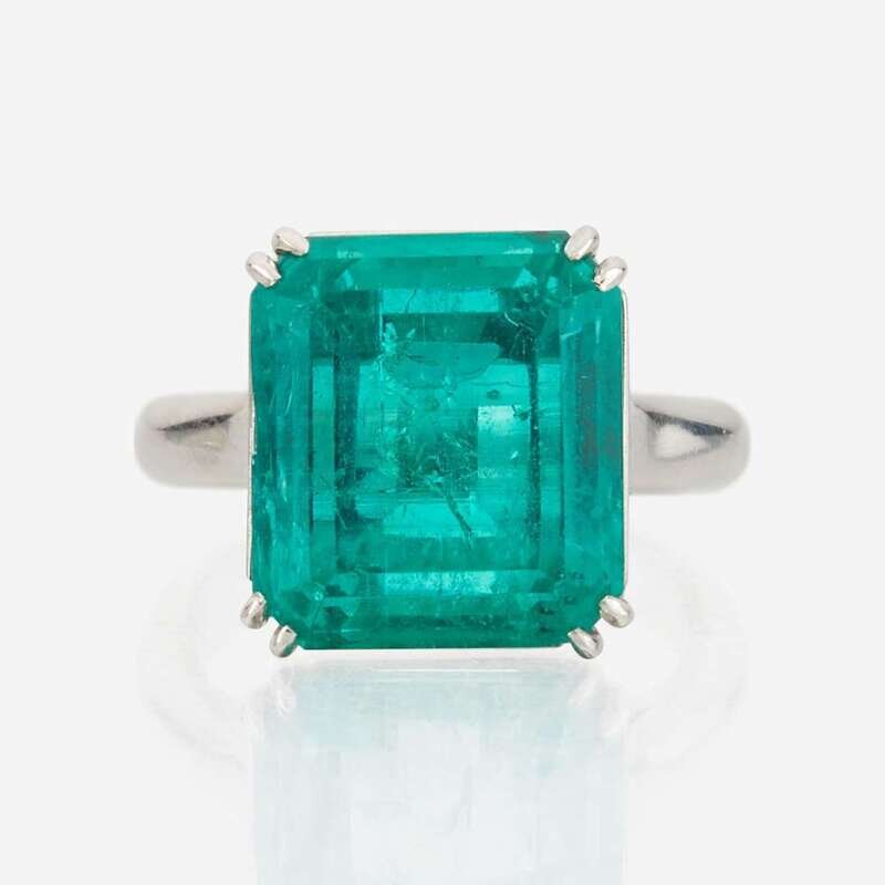 centering an emerald weighing approximately 9.00 carats, mounted in platinum, completed by a 14K white gold arthritic shank.